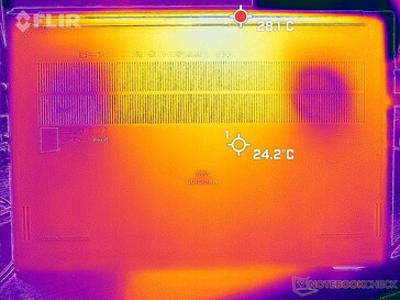 Im Leerlauf sind die Oberflächentemperaturen höher als erwartet, da die Lüfter hier so lange ausbleiben bis sie wirklich benötigt werden. Hot Spots erreichen 37 °C auf der Ober- und 32 °C auf der Unterseite, verglichen mit den unter 30 °C beim ExpertBook B6 Flip.