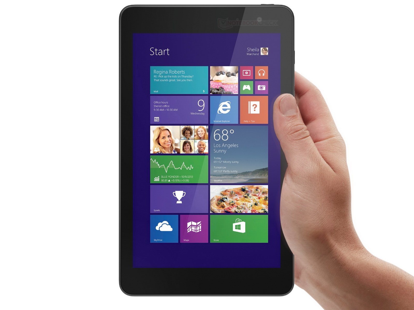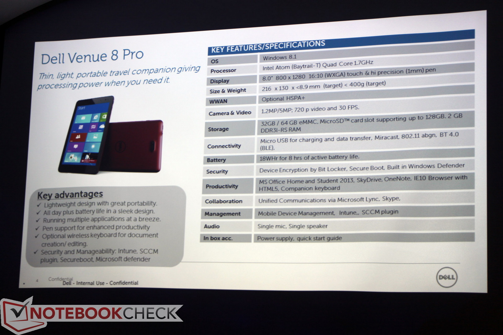 Das rund 400 Gramm schwere Venue 8 Pro misst 216 x 130 x 8,9 Millimeter und kommt mit Intel Atom Bay Trail Quad-Core (1,7 GHz), 2 GByte RAM und 32 oder 64 GByte eMMC-Speicher daher, der sich via microSD-Kartenslot um bis zu 128 GByte erweitern lässt. Der 8-Zoll-Multitouchscreen unterstützt Stifteingaben und bietet eine Auflösung von 1.280 x 800 Pixeln.