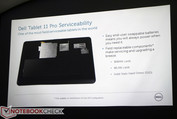 Während für das Dell Venue 11 Pro in der Bay-Trail-Variante Modelle mit HD und Full HD verfügbar sind, hat das Pro-Tablet generell ein 10,8"-FHD-Display an Bord. Optional stehen auch Modellvarianten mit Fingerabdruck- und Smartcard-Reader zur Auswahl. Dank der Wartungsklappe an der Tablet-Rückseite lässt sich der Akku und die Kommunikationsmodule wechseln. Der Speicher soll laut Dell durch den Endkunden allerdings nicht tauschbar sein.