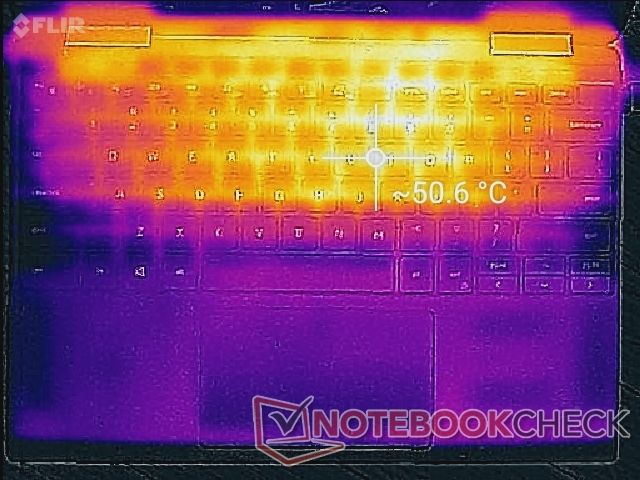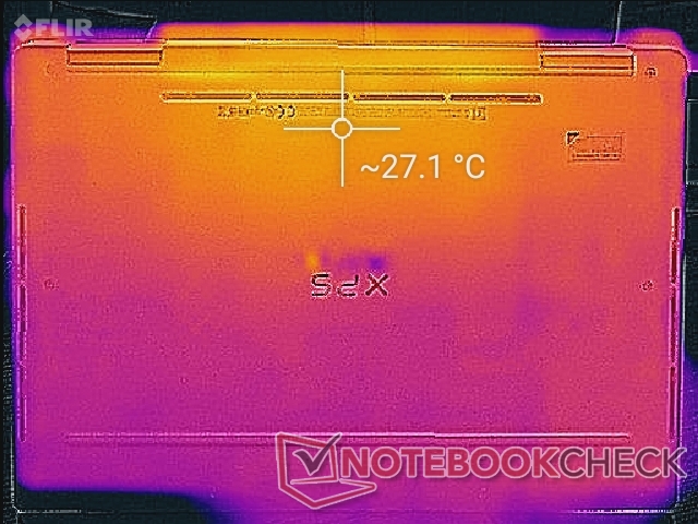 Auch die Oberflächentemperatur hat sich im Vergleich zum Ice-Lake-XPS-13-7390-2-in-1 nicht verändert. Die Hotspots liegen bei 50 °C oben und 57 °C unten. Die Tastatur ist weiterhin wärmer als bei vielen anderen Subnotebooks, wie etwa dem neuen Samsung Galaxy Book Pro 360.