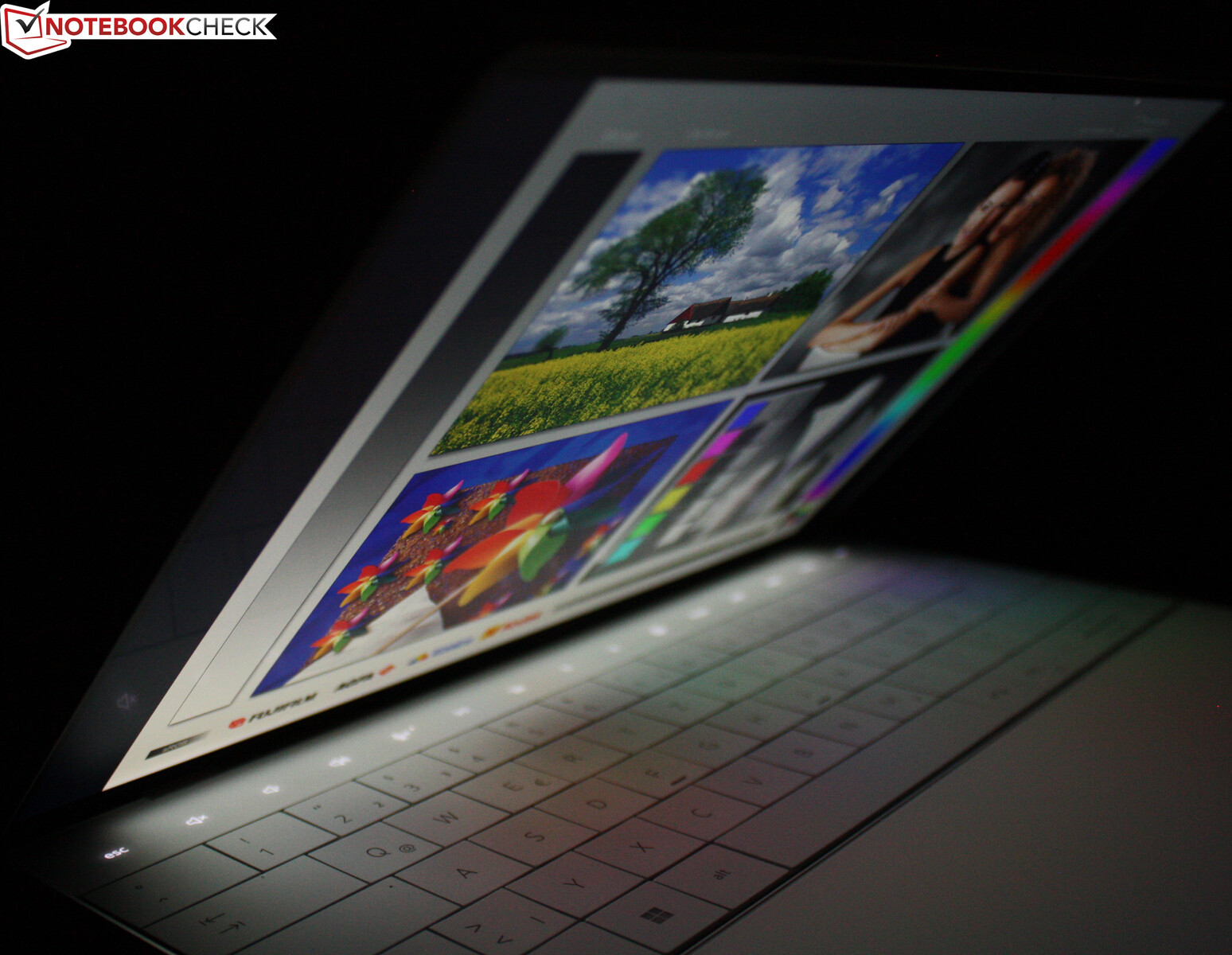 Das 4K-Panel in der Plus-Version mit i7 (Sharp LQ134R1) war in unseren Messungen mit 473 cd/m² (Durchschnitt) identisch leuchtstark, aber kontraststärker. 1.764:1 statt 940:1, das spricht für das 4K-Panel. Es gibt ein alternatives OLED-Panel für die Plus-Variante, das hatten wir aber noch nicht im Test.