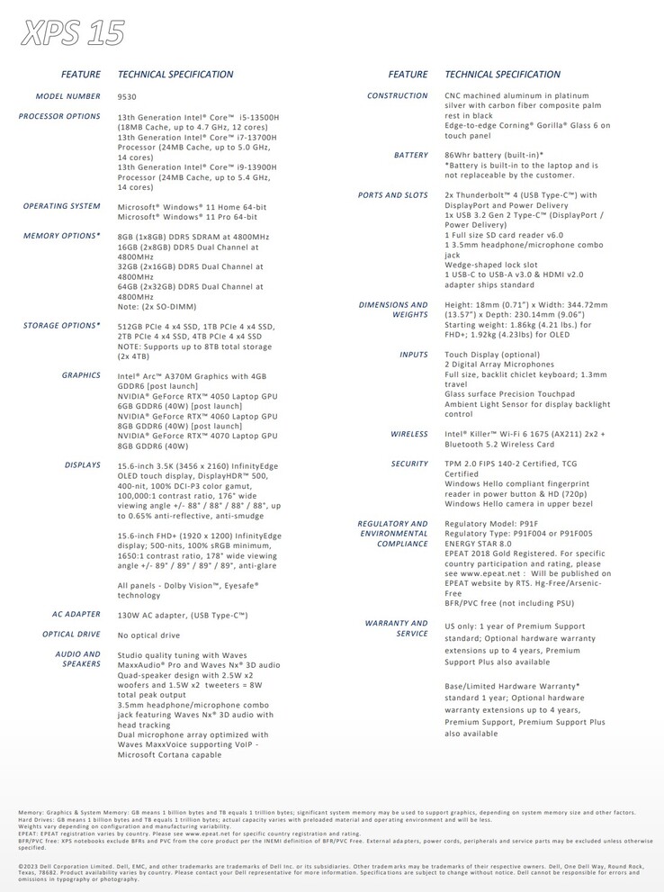 Sehr wohl steigen sollte die CPU- und GPU-Performance und zwar dank des moderneren Innenlebens auf Basis der Intel Raptor Lake und Nvidia Ada Lovelace Generationen. Konkret wird es das XPS 15 unter der Modellnummer 9530 mit Core i9-13900H, Core i7-13700H und Core i5-13500H geben, als GPU-Optionen stehen Nvidia Geforce RTX 4070, RTX 4060 und RTX 4050 zur Auswahl - neben einer Intel Arc A370M. Die Nvidia-Chips sind hier auf maximal 40 Watt begrenzt, können sich also noch etwas weniger entfalten als im XPS 17 mit maximal 60 Watt.