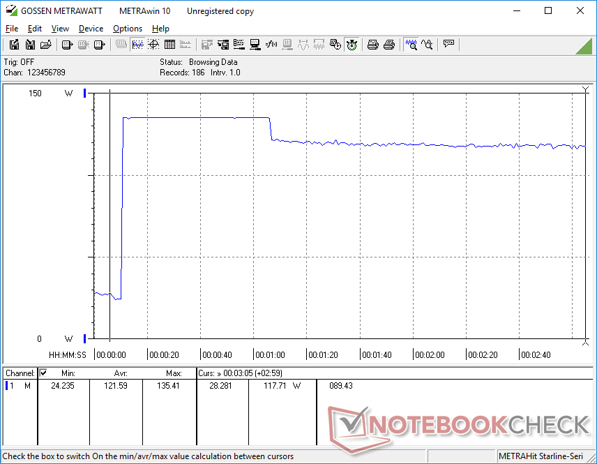 Der Energieverbrauch hat sich seit dem älteren XPS 17 9720 nicht wirklich geändert, da bisher alle XPS-17-Modelle mit dem gleichen 130-W-USB-C-AC-Adapter ausgeliefert werden. Wenn man das Gerät mit anderen Laptops mit CPUs der H-Serie und GPUs der RTX-Serie vergleicht, ist der 130-W-Adapter einer der kleinsten, sowohl physisch als auch von der Stromausgabe. Dabei muss man zu Gunsten der Portabilität auf eine höhere Leistung und schnelles Laden verzichten.