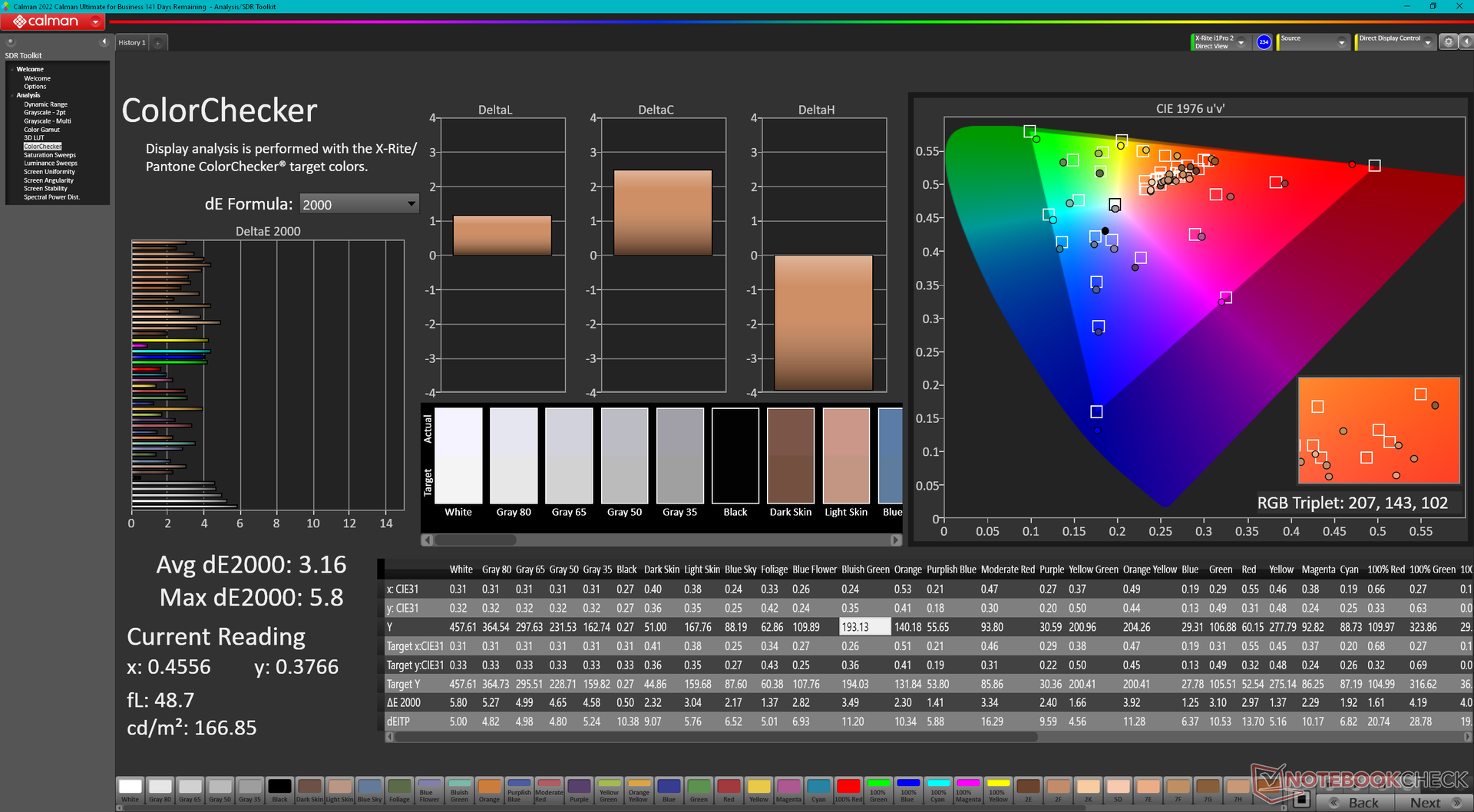 | Delta E Colorchecker * | 3.16 | 5.98 -89% | 3.35 -6% | 1.66 47% | 2.48 22% | 1.5 53% |