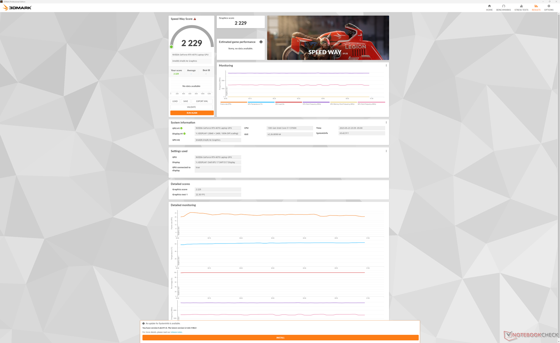 | 90 % v7 (old) | 05 / 2023 | Dell XPS 17 9730 RTX 4070 i7-13700H, GeForce RTX 4070 Laptop GPU | 2.5 kg | 19.5 mm | 17.00" | 3840x2400 | |