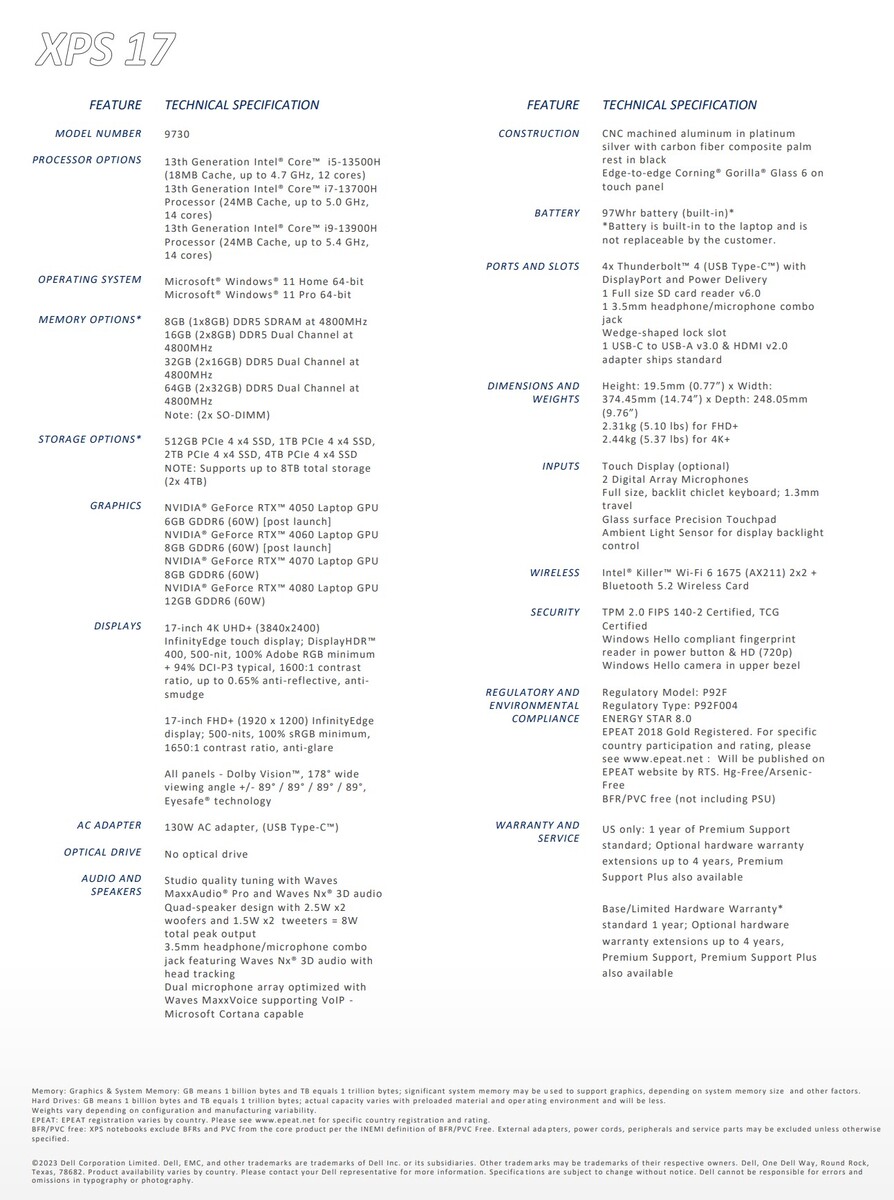 Die wichtigsten Neuerungen sind natürlich im Inneren zu finden. Die 2023-Version des Dell XPS 17 setzt auf Intels 13. Core Generation der H-Serie also Core i9-13900H, Core i7-13700H und Core i5-13500H. Kombiniert wird mit Intels neuer Geforce RTX 40 Serie, also RTX 4080, RTX 4070, RTX 4060 und RTX 4050, allesamt allerdings limitiert auf 60 Watt. Maximal 64 GB DDR5 RAM sowie 2x 4 TB PCIe SSD-Speicher sind konfigurierbar, mit 97 Whr Akku wiegt das Dell XPS zwischen 2,31 kg und 2,44 kg je nach Display-Option.