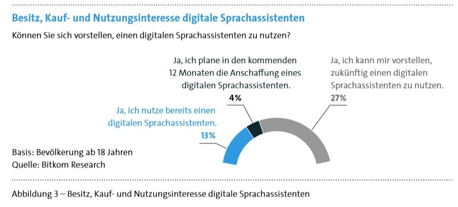 13 Prozent der Umfrageteilnehmer ab 18 Jahren und damit rund jeder achte Bundesbürger nutzt bereits einen intelligenten Lautsprecher mit digitalem Sprachassistenten wie Amazon Echo, Google Home oder Apple HomePod. Das entspricht 8,7 Millionen Menschen in Deutschland. Auch das Wissen um Sprachsteuerung hat sich rasant verbreitet. 84 Prozent haben schon von digitalen Sprachassistenten gehört, 2017 waren es erst 69 Prozent. 2016 gerade einmal 5 Prozent. 27 Prozent der Befragten können sich vorstellen, zukünftig per Sprache Geräte zu steuern und 4 Prozent wollen sich in den nächsten 12 Monaten einen Sprachassistenten anschaffen.