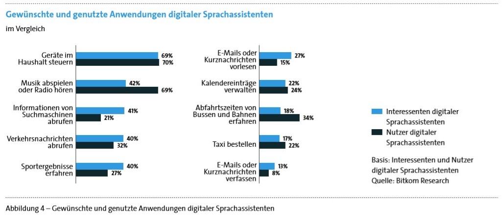 69 Prozent spielen per Sprachbefehl Musik ab und hören Radio. 34 % der Nutzer erfragen die Abfahrtszeiten von öffentlichen Verkehrsmitteln, lässt sich Verkehrsnachrichten (32 Prozent) durchgeben, 27 Prozent informieren sich über aktuelle Sportergebnisse, 22 Prozent bestellen informieren, jeder Fünfte bestellen ein Taxi oder stellen allgemeine Suchanfragen (21 Prozent). 24 % hat schon über Spracheingabe seinen Kalender aktualisiert und 15 Prozent lassen sich von der künstlichen Intelligenz Mails vorlesen. Erst 8 Prozent diktieren ihre Nachrichten.