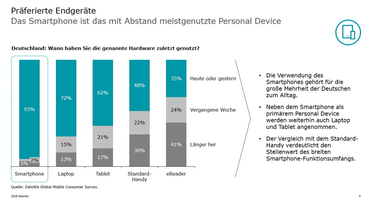 Viele Konsumenten halten das Smartphone inzwischen für unverzichtbar. Das ist angesichts der sehr hohen Nutzungsintensität für Smartphones auch nicht besonders verwunderlich. Das internationale Wirtschaftsprüfungs- und Beratungsunternehmen Deloitte stellt in einer weiteren Kurzstudie zum Thema Mobilfunknutzung dar, dass der typische Smartphone-Nutzer in Deutschland im Jahr 2018 das Smartphone in fast allen Alltagssituationen nutzt. Hier die Zusammenfassung und wichtigsten Ergebnisse der Deloitte-Studie: