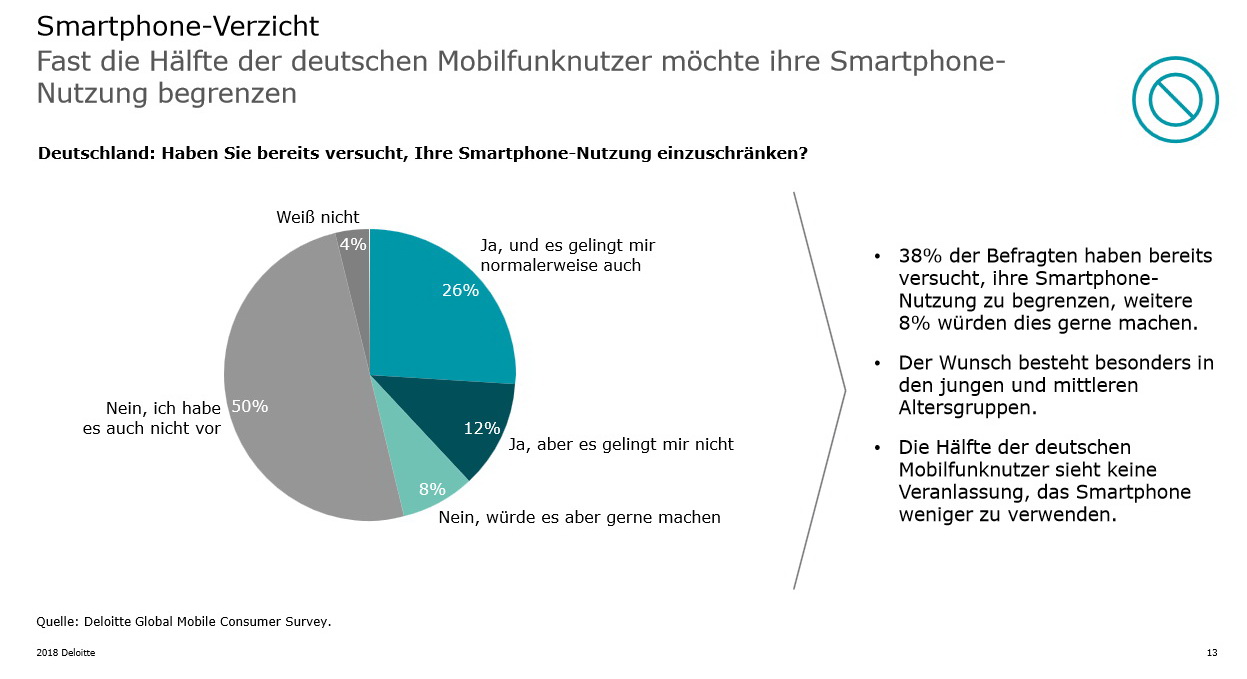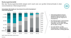 Deloitte: Jüngere im Alter zwischen 18 und 24 Jahren vom Smartphone-Display "weg" zu bekommen ist schwierig. Denn die Jüngeren kleben förmlich am Smartphone. Ganze 56 Mal schauen die jungen Deutschen am Tag auf ihr Smartphone. Mit dem Älterwerden änder sich das rapide. Im Rentenalter schauen die Smartphone-Nutzer im Schnitt nur noch neun Mal täglich für Neuigkeiten auf das Display. Altersübergreifend haben die Bürger in Deutschland knapp 30 Blickkontakte auf die "digitale Verbindung zur Welt".