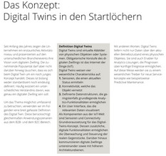 Deloitte charakterisiert Digital Twins als virtuelle Abbilder von physischen Objekten oder Systemen, mit dem Internet der Dinge (IoT) als "Vorstufe des digitalen Zwillings". Digital Twins weisen demnach vier wesentliche Charakteristika auf: