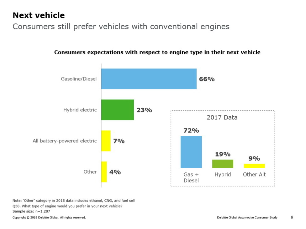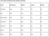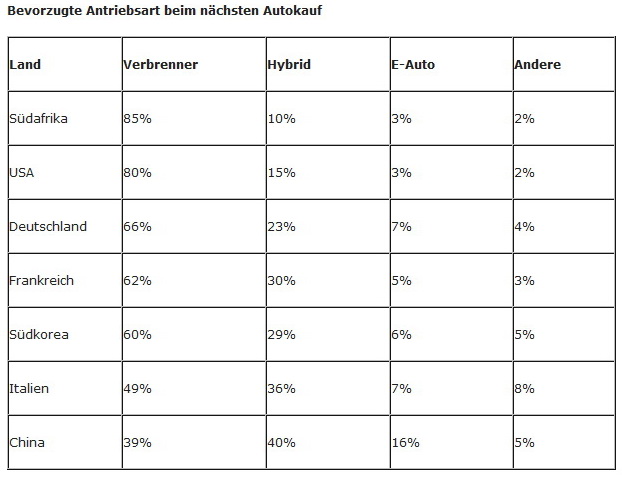 Autointeressenten sind hierzulande laut der Deloitte-Studie nicht bereit, Zusatzkosten für Elektroantriebe zu akzeptieren. So bleibt die Mehrheit der Deutschen derzeit noch dem klassischem Verbrenner als Benziner treu. In den USA liegt der Anteil sogar bei 80 Prozent. In China ist das anders. China ist und bleibt aktuell der Vorreiter für Elektromobilität. Im Reich der Mitte genießt der Elektroantrieb die höchste Popularität unter allen Ländern (16 Prozent, Hybrid: 40 Prozent). In Deutschland würden sich aufgrund mangelnder Reichweite und des höheren Grundpreises nur 7 Prozent für ein reines Elektroauto entscheiden. Für 23 Prozent käme ein Hybridfahrzeug infrage.