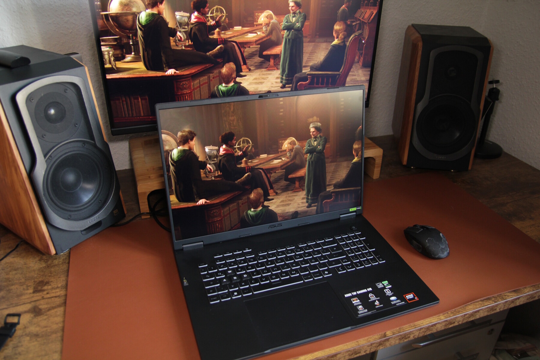 Allerdings hat uns das A18 auch positiv überrascht: Asus stellt interessante Dinge mit dem „Performance“-Modus an, was dazu führt, dass der Laptop für ein paar wenige Frames weniger deutlich ruhiger, kühler und auch sparsamer bleibt. Zudem ist das 18-Zoll-Gehäuse flacher als das eines Razer Blade 18 und wiegt für einen Desktop-Replacement auch erstaunlich wenig. Hinzu kommt die überraschend gute Akkulaufzeit. Und obwohl das Display nicht die beste Auflösung oder Farbraumabdeckung hat, lässt es sich wunderbar kalibrieren und die Delta-E-Werte unter 1 drücken.