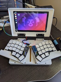 Der Formfaktor ergibt sich aus dem 7 Zoll Touchscreen mit seiner Auflösung von 1.024 x 600 Pixel, der ähnliche Maße besitzt wie der verwendete Akku und die zusammenklappbare Tastatur. Die Tastatur dürfte allerdings für viele Nutzer gewöhnungsbedürftig sein, denn diese besitzt nicht nur ein ungewöhnliches Format, sondern auch das Miryoku-Layout, das mit QWFPB statt mit QWERT beginnt, und bei dem viele Tasten mehrfach belegt sind. Da die Tasten nicht einmal beschriftet sind, sollten Neulinge auf eine andere Tastatur oder zumindest auf beschriftete Tasten zurückgreifen.