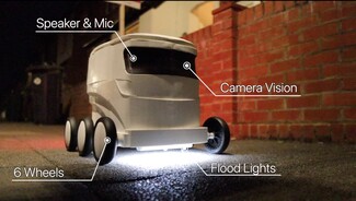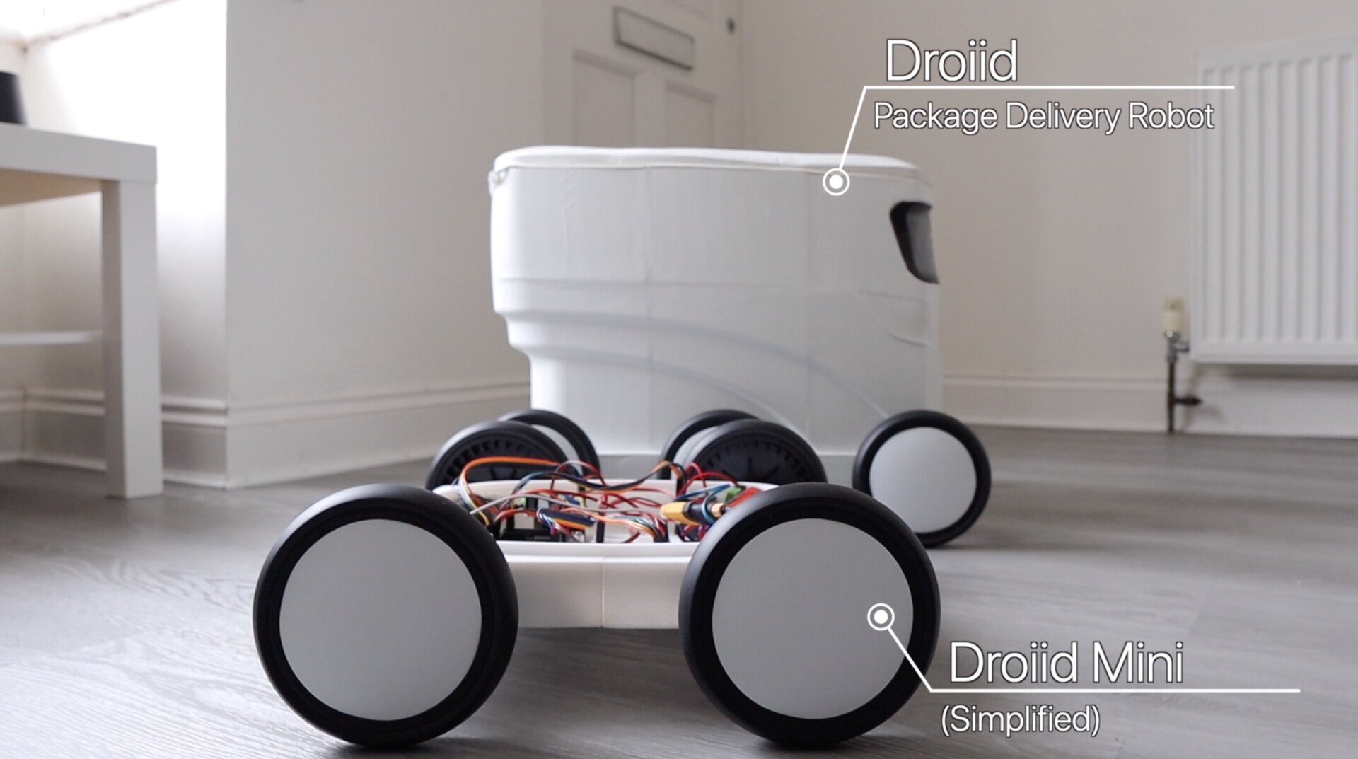 Dabei können sogar Befehle, die im YouTube Live-Chat gepostet werden, ausgeführt werden. Der Roboter kann somit aus der ganzen Welt ferngesteuert werden. Mit einer Ladekapazität von gut 10 Kilogramm kann der Roboter mit insgesamt sechs Rädern vor allem kleinere Lieferungen an den Mann oder die Frau bringen. Die integrierten LEDs, die als Blinker verwendet werden können, helfen dem Delivery-Bot dabei, sich sicher fortzubewegen und seine Fahrtrichtung anzuzeigen. Dabei kommen in der kleineren Version des Droiid 4 Elektromotoren und ein 7.4V LiPo Akku mit 2200mAh zum Einsatz.