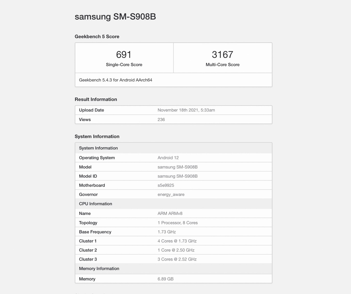 Das Galaxy S22 Ultra mit dem Exynos 2200 wurde nun bei Geekbench gesichtet, mit einem Ergebnis von 691 Punkten (Single-Core) respektive 3.167 Punkten (Multi-Core) kann der Chip aber noch nicht überzeugen. Zum Vergleich: Der Snapdragon 888 kommt in unseren Benchmarks im Schnitt auf 1.129 Punkte respektive 3.629 Punkte. Dieses Ergebnis und die recht geringen Taktfrequenzen von bis zu 2,52 GHz deuten darauf hin, dass es sich hierbei um einen frühen Prototyp handelt, denn das Galaxy S22+ konnte mit demselben Chip vor einigen Monaten bereits ein besseres Ergebnis erzielen.