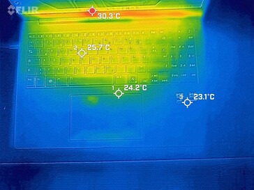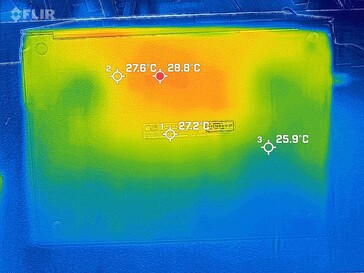 (+) Die Handballen und der Touchpad-Bereich sind mit gemessenen 26.9 °C kühler als die typische Hauttemperatur und fühlen sich dadurch kühl an.