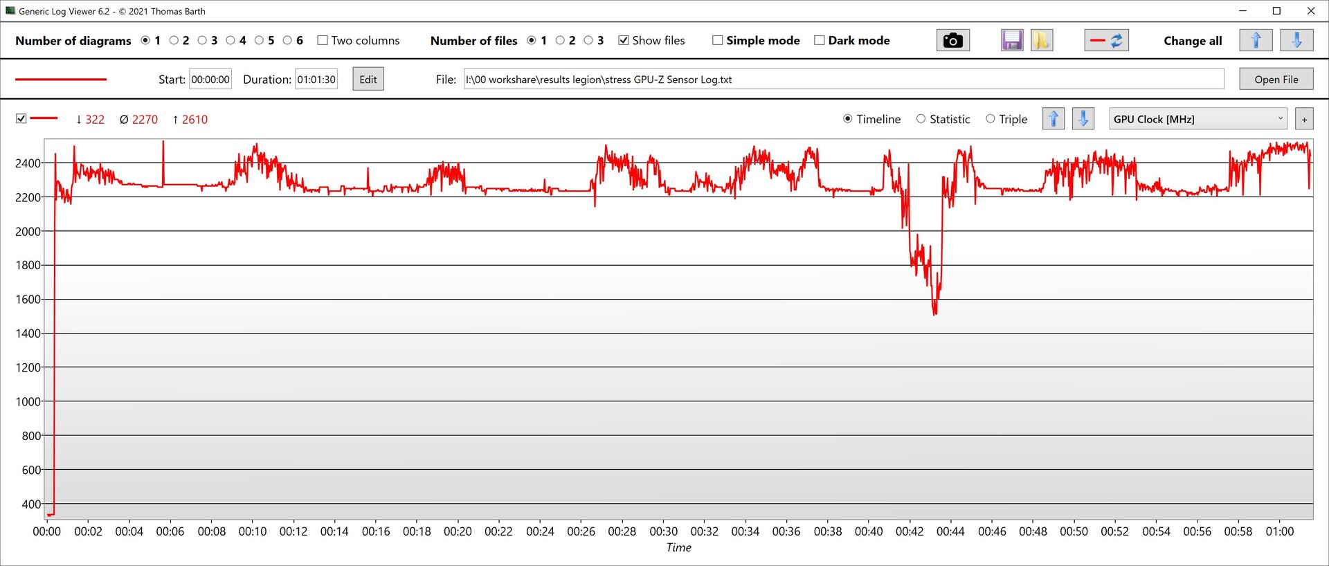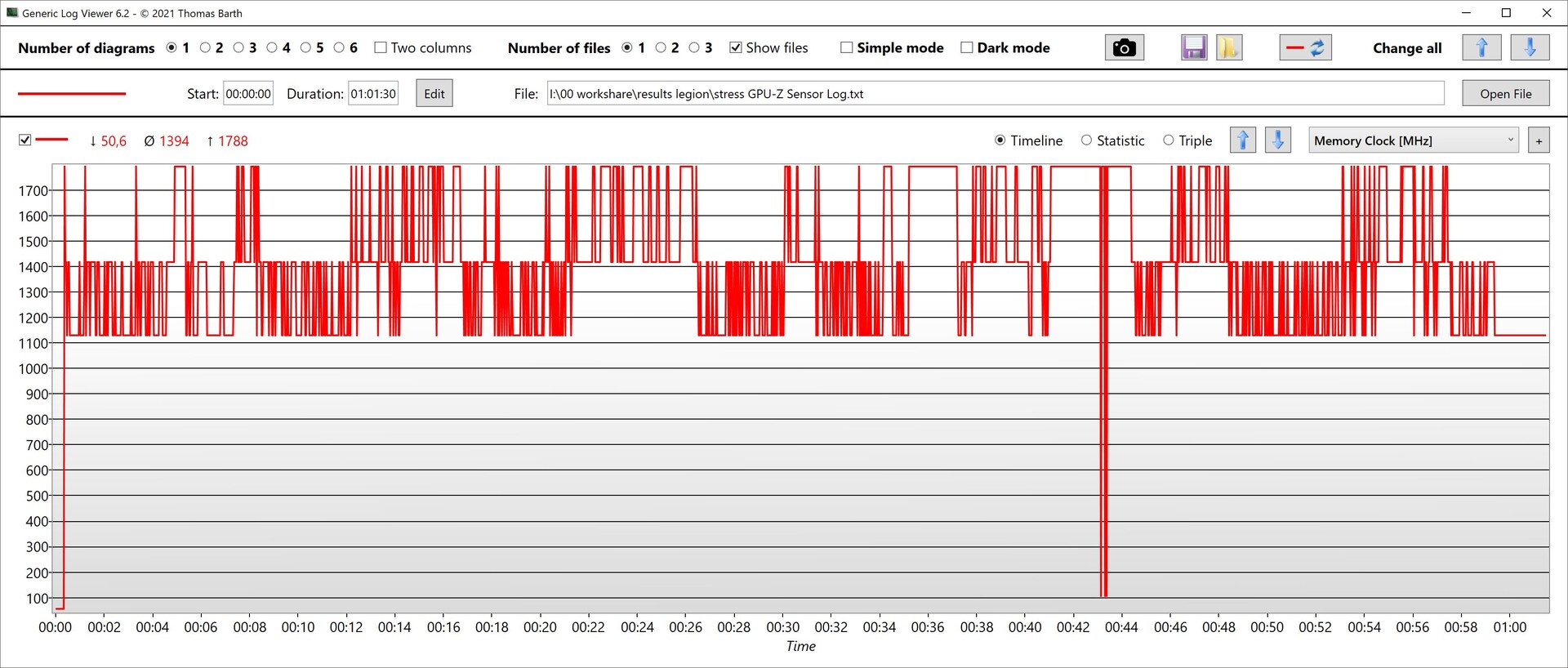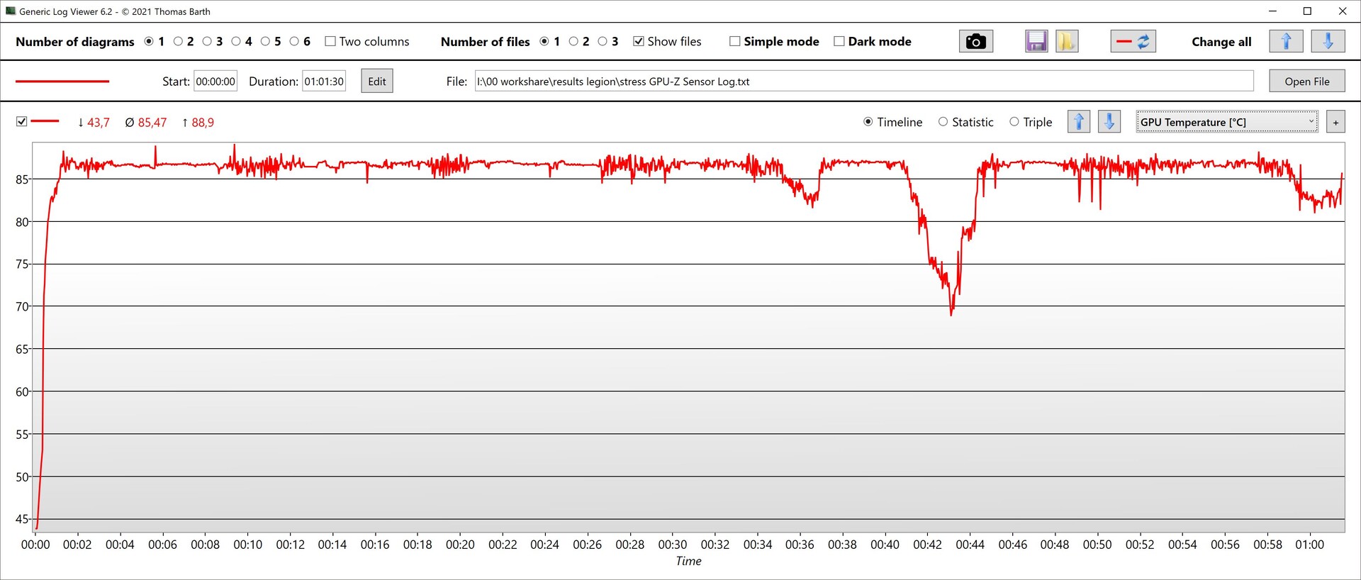 Währenddessen pendelt der GPU-Takt grob zwischen 2,2 und 2,5 GHz, der Speichertakt macht größere Sprünge zwischen 1,1 und 1,8 GHz. Dabei liegt die Temperatur bei um die 85 °C, die GPU zieht rund 125 W aus dem Netzteil.