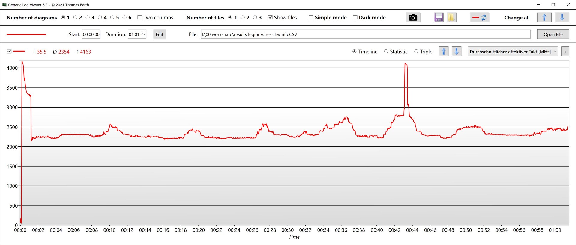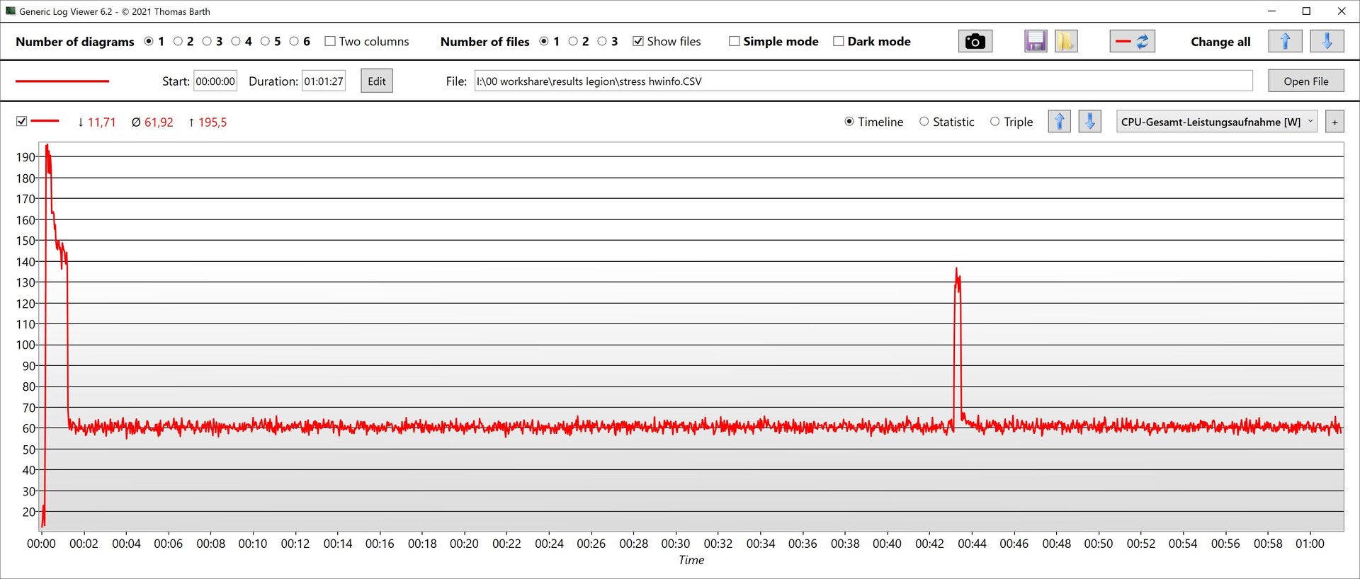 Den 1-stündigen Stresstest starten die CPU-Kerne nur kurz mit 4,1 GHz (195 W). Dabei überschreitet die CPU die Temperaturschwelle von 100 °C, woraufhin der Takt und die Leistungsaufnahme auf ca. 2,3 GHz und 60 W fallen und dann relativ konstant bleiben. Die Temperatur liegt dann bei um die 82 °C.