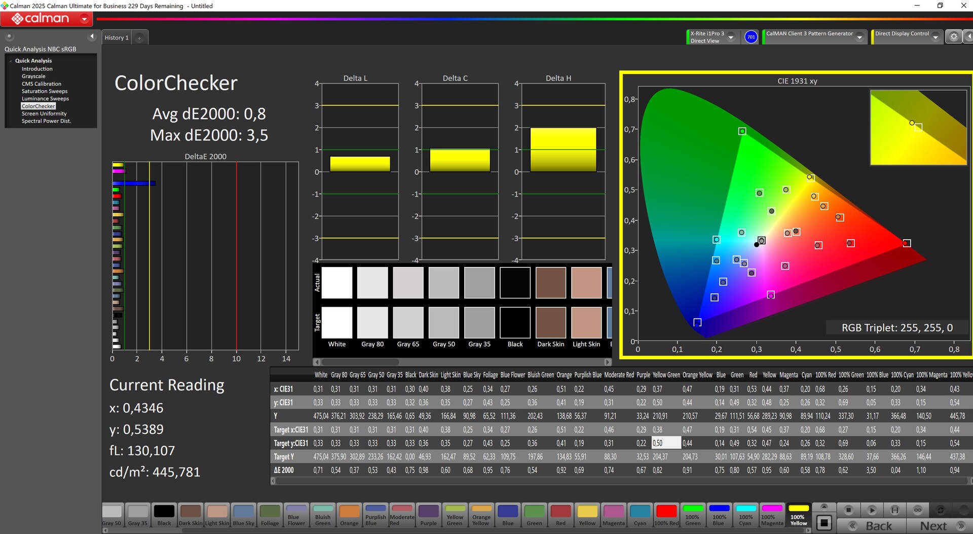 | Colorchecker dE 2000 calibrated * | 0.8 | 0.65 19% | 5.7 -613% | 2.03 -154% | 2.5 -213% | 1.5 -88% |