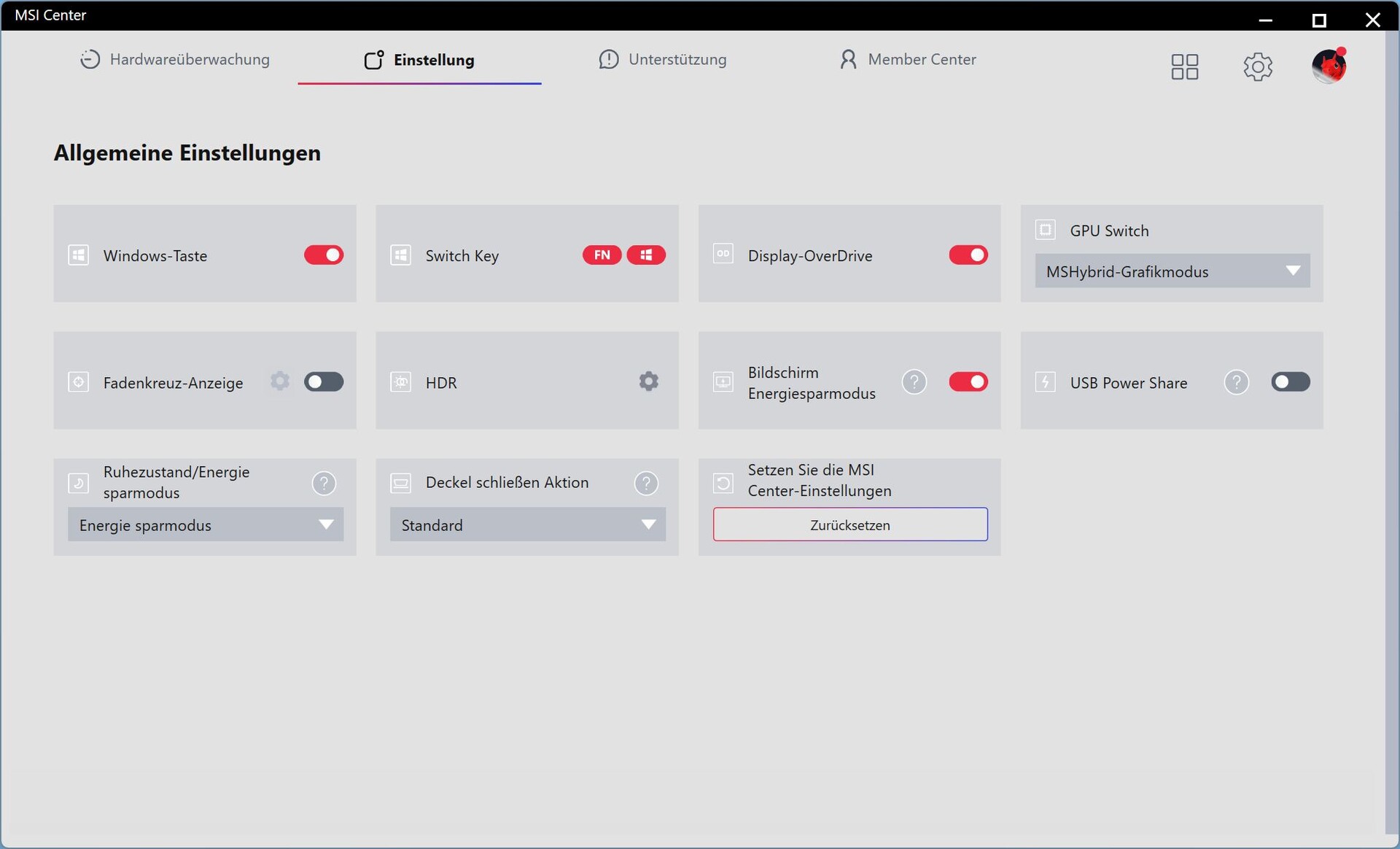 Von den vier Leistungsprofilen wählen wir die KI-Engine, ein MUX ist im MSI Center ebenfalls integriert.