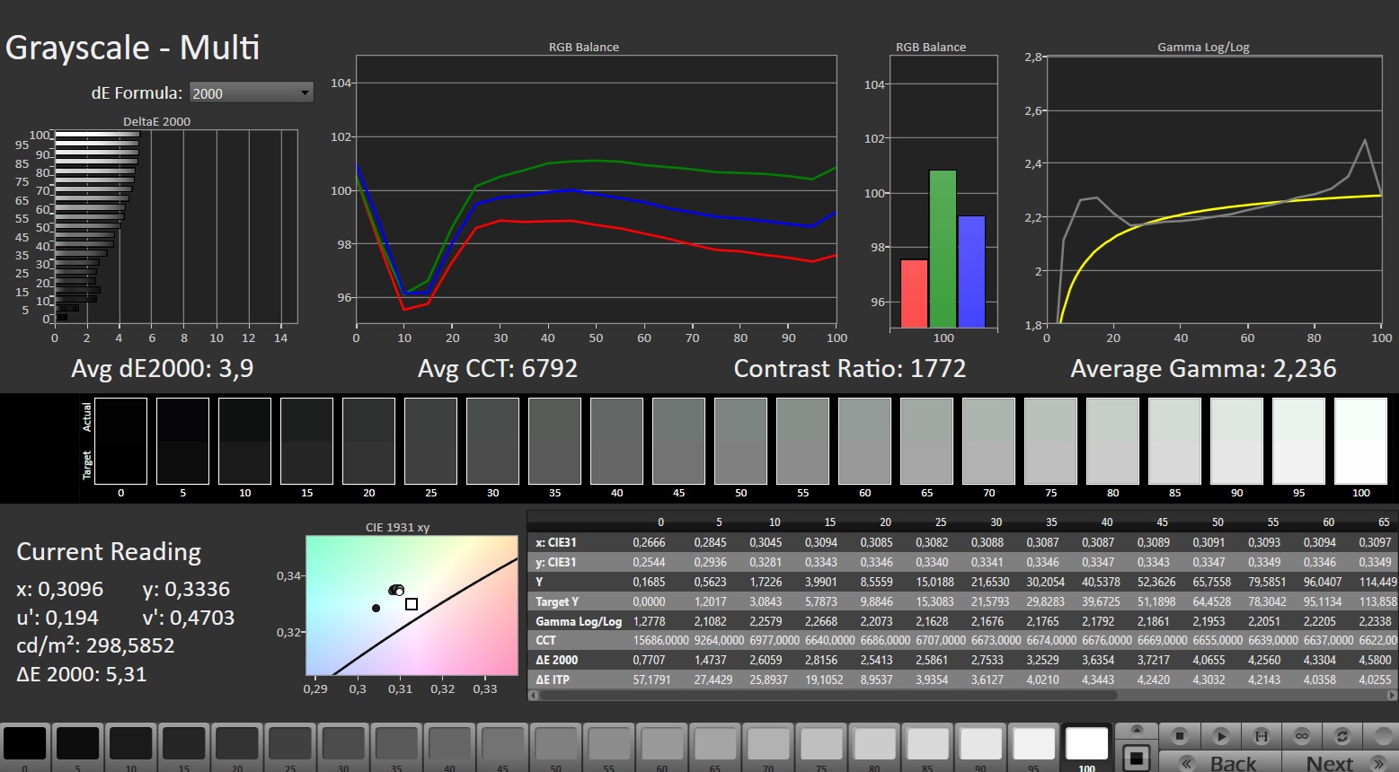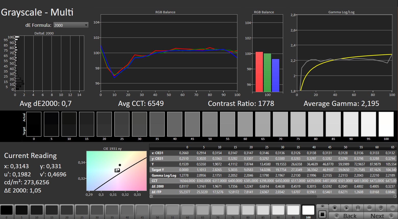 | Delta E Graustufen * | 3.9 | 2.16 45% | 2.4 38% | 3.9 -0% | 1.9 51% | 1.2 69% |