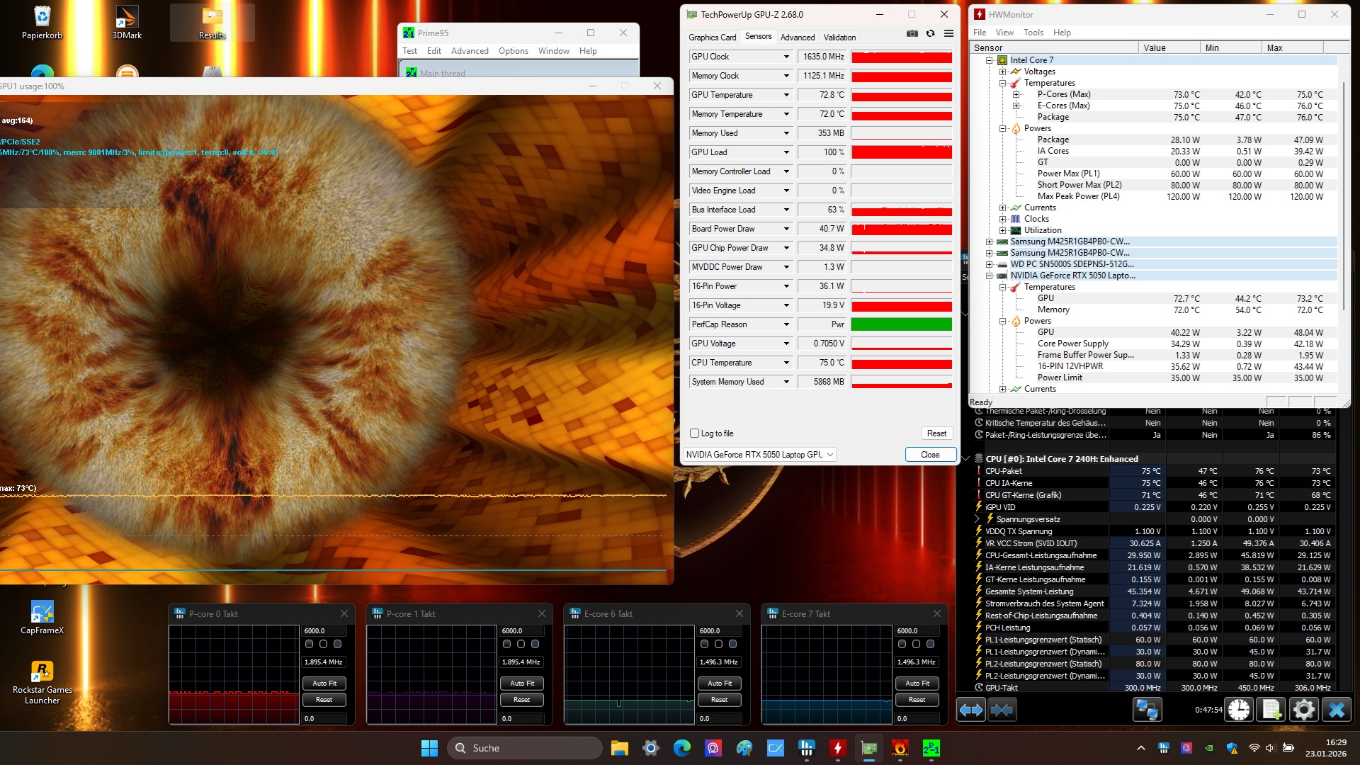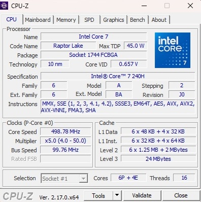 Beim verbauten Core 7 240H handelt es sich um ein 10-nm-Modell aus der der Raptor Lake-Generation, der sechs Performance-Kerne inklusive Hyper-Threading und vier Effizienzkerne ohne HT enthält, wodurch insgesamt 16 parallele Threads möglich sind. Im CPU-Parcours macht es sich der Chip zwischen dem Core i5-13420H des Victus 15 bzw. Acer Nitro V 15 und dem Core i7-12650H des alten Cyborg 15 bequem. Die Konkurrenz aus dem Hause AMD zieht zumindest in Form des Ryzen 7 250 (Lenovo LOQ 15) bzw. Ryzen 7 260 (Lenovo Legion 5 15) davon.