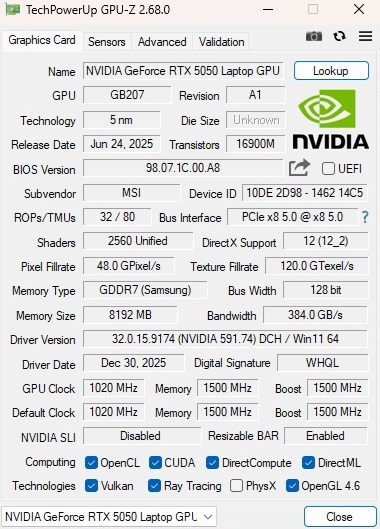 Ebenfalls diskussionswürdig ist die Power der Grafikkarte: Da MSI der RTX 5050 nur magere 45 Watt TGP spendiert, bleibt die GPU-Leistung hinter ihren Möglichkeiten, wie wir im Verlauf des Artikels zeigen werden, wobei sich im Gegenzug die Geräuschentwicklung in Grenzen hält. Die restliche Ausstattung fällt angesichts eines Core 7 240H, 16 GB DDR5-RAM (2x 8 GB) und einer 512-GB-SSD solide, aber nicht üppig für den Preis aus. Pluspunkte gibt es derweil für den Privacy Shutter der Webcam, welcher vor allem bei Gaming-Laptops nicht selbstverständlich ist.