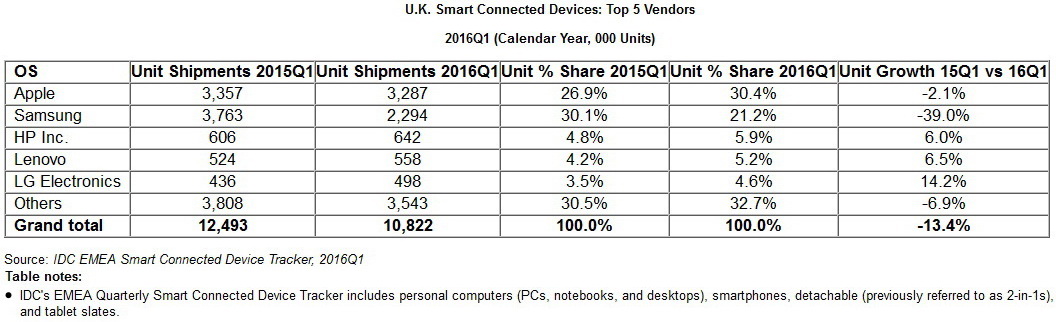 In der entsprechenden Tabelle zu den Top-5-Vendors für Smart-Connected-Devices in UK wirft IDC alles in einen Topf: Personal Computer (Desktops und Notebooks), Smartphones, Detachables (vorher als 2-in-1 geführt) und Tablet Slates. Hieraus wird ersichtlich, dass der Gesamtmarkt für diese Geräte in UK im 1. Quartal 2016 zum Vergleichszeitraum Q1/2015 um 13,4 Prozent verloren hat. Während Apple mit minus 2,1 Prozent noch mit einem blauen Auge davonkommt, musste Samsung mit einem heftigen Minus von 39 Prozent auf den Inseln ordentlich Federn lassen.