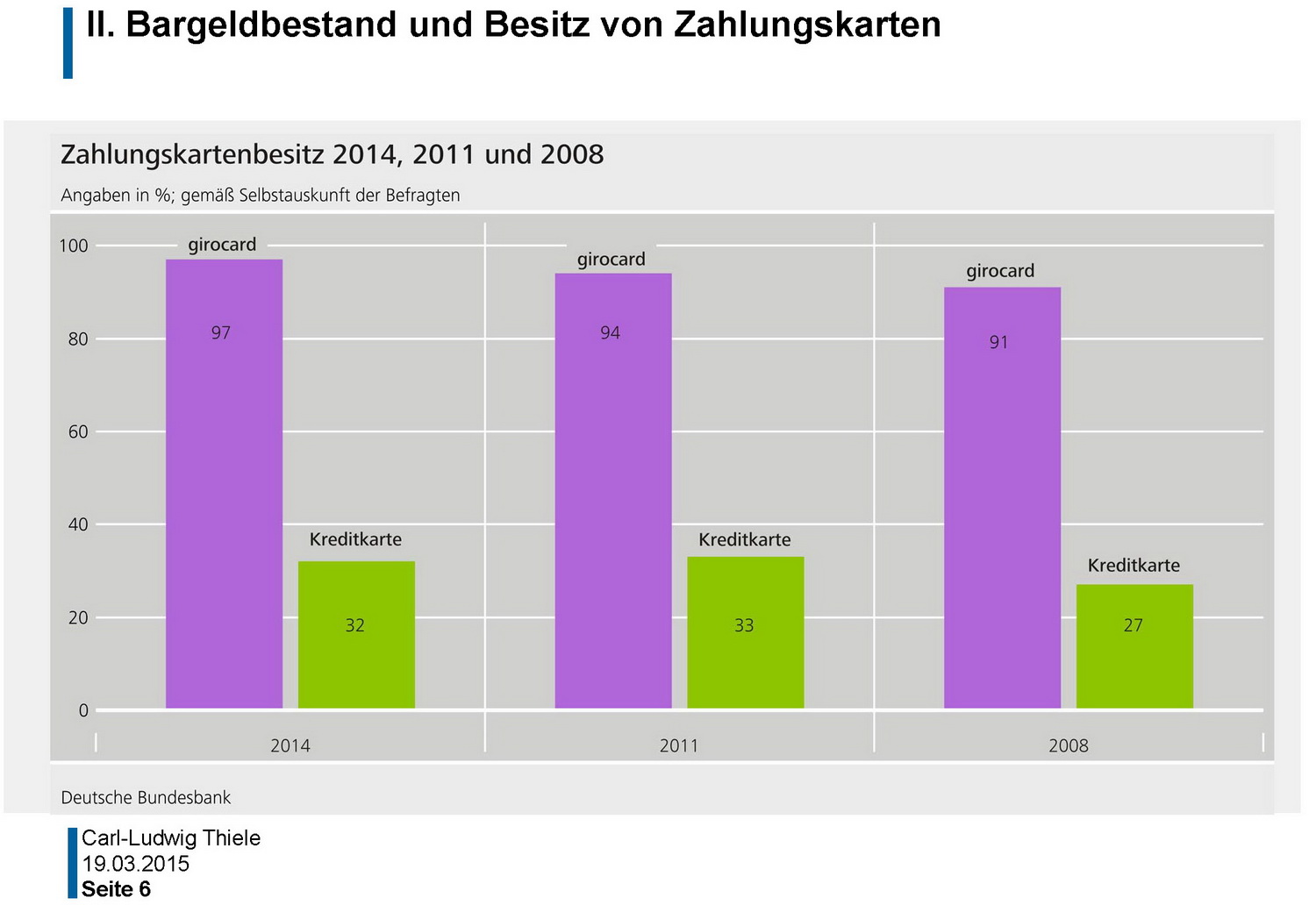 47 Prozent der erfassten Umsätze werden laut der aktuellen Studie hingegen bargeldlos mit Zahlungskarten, Überweisungen oder Lastschriften gezahlt. Dazu zählen auch wiederkehrende Zahlungen, wie beispielsweise Mieten. Bei bargeldlosen Zahlungen greifen Verbraucher hierzulande bevorzugt zur Girocard, früher EC-Karte genannt. Allerdings ist der Bargeldanteil, bezogen auf die Zahl aller Transaktionen, gegenüber 2011 weiter gesunken.