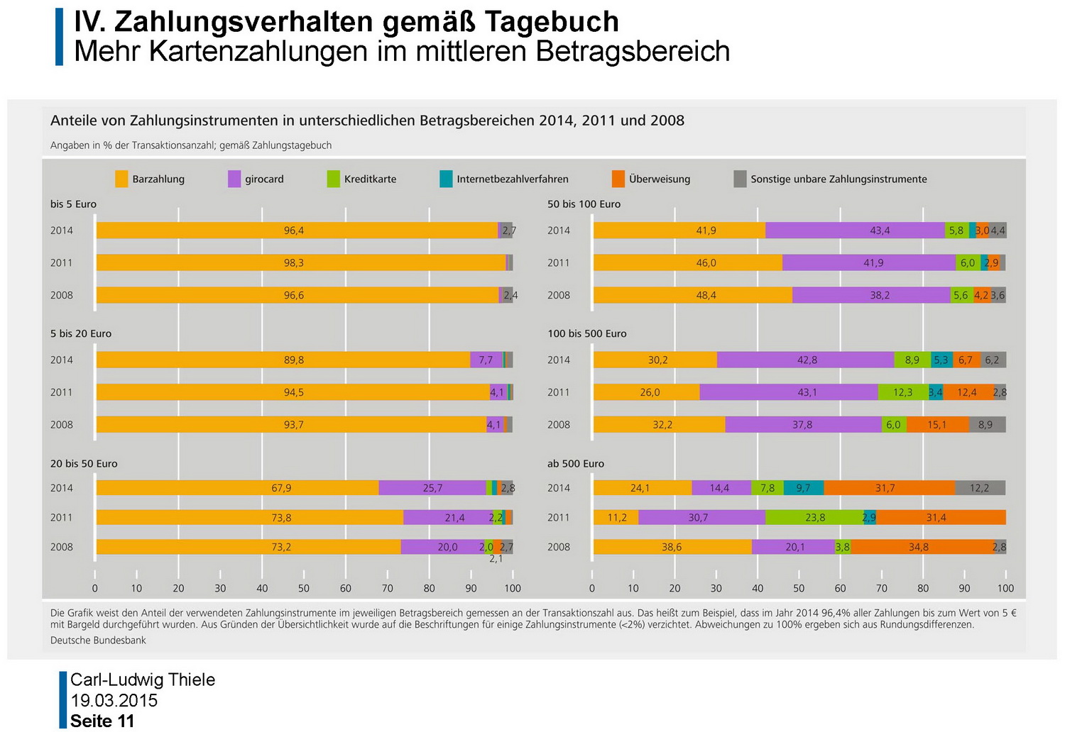 Laut der dritten Studie der Deutschen Bundesbank zum "Zahlungsverhalten in Deutschland" ist Bargeld nach wie vor das am meisten genutzte Zahlungsmittel der Verbraucher. 53 Prozent der Privatpersonen zahlen demnach bevorzugt mit Münzen und Banknoten. Im Vergleich zu 2014 ist der Barzahlungsanteil gleich geblieben. Bar werden vor allem kleine Beträge unter 20 Euro bezahlt.