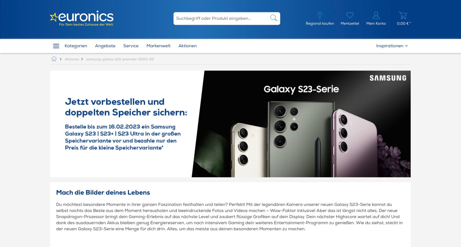 Die Aktionsseite von Euronics zeigt aber bereits, dass der Fokus beim Marketing auf den Kameras liegen wird. Der Promo-Text verspricht eine "legendäre Kamera mit Wow-Faktor", die auch bei Nacht beeindruckende Fotos und Videos macht. Samsung geht auch auf die Performance des Qualcomm Snapdragon 8 Gen 2 und auf die längere Akkulaufzeit der Geräte ein.