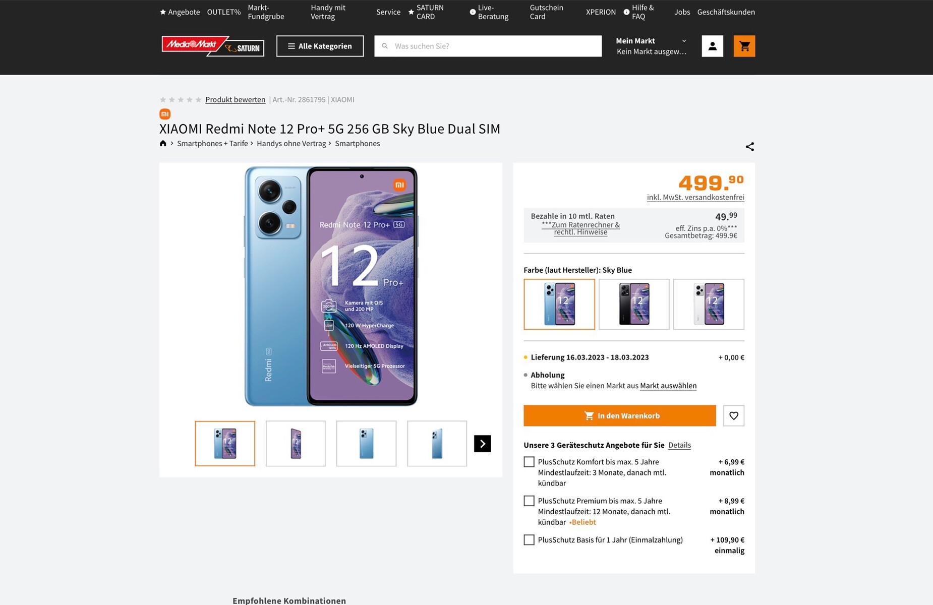 Wie Roland Quandt entdeckt hat, listet Saturn das Redmi Note 12 Pro+ bereits zum Preis von 499,90 Euro, und zwar in den Farben Blau, Weiß und Schwarz. Tatsächlich kann das Smartphone schon bestellt werden, die Lieferung erfolgt laut der Angaben des Onlineshops zwischen 16. und 18. März, sodass der offizielle Verkaufsstart unmittelbar bevorstehen sollte.