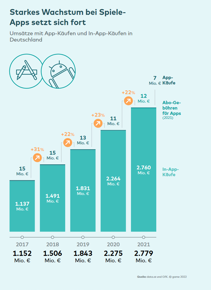 Alleine in Deutschland kletterte der Umsatz mit Computer- und Videospielen sowie dazugehöriger Hardware kräftig um 17 Prozent auf rund 9,8 Milliarden Euro. Deutschland bleibt damit in Europa der größte Games-Markt nach Umsatz und weltweit Nummer fünf. Die größten Wachstumstreiber waren Spielekonsolen (+23 Prozent) und Zubehör für Spiele-PCs (+22 Prozent), sowie In-Game- und In-App-Käufe (+30 Prozent).