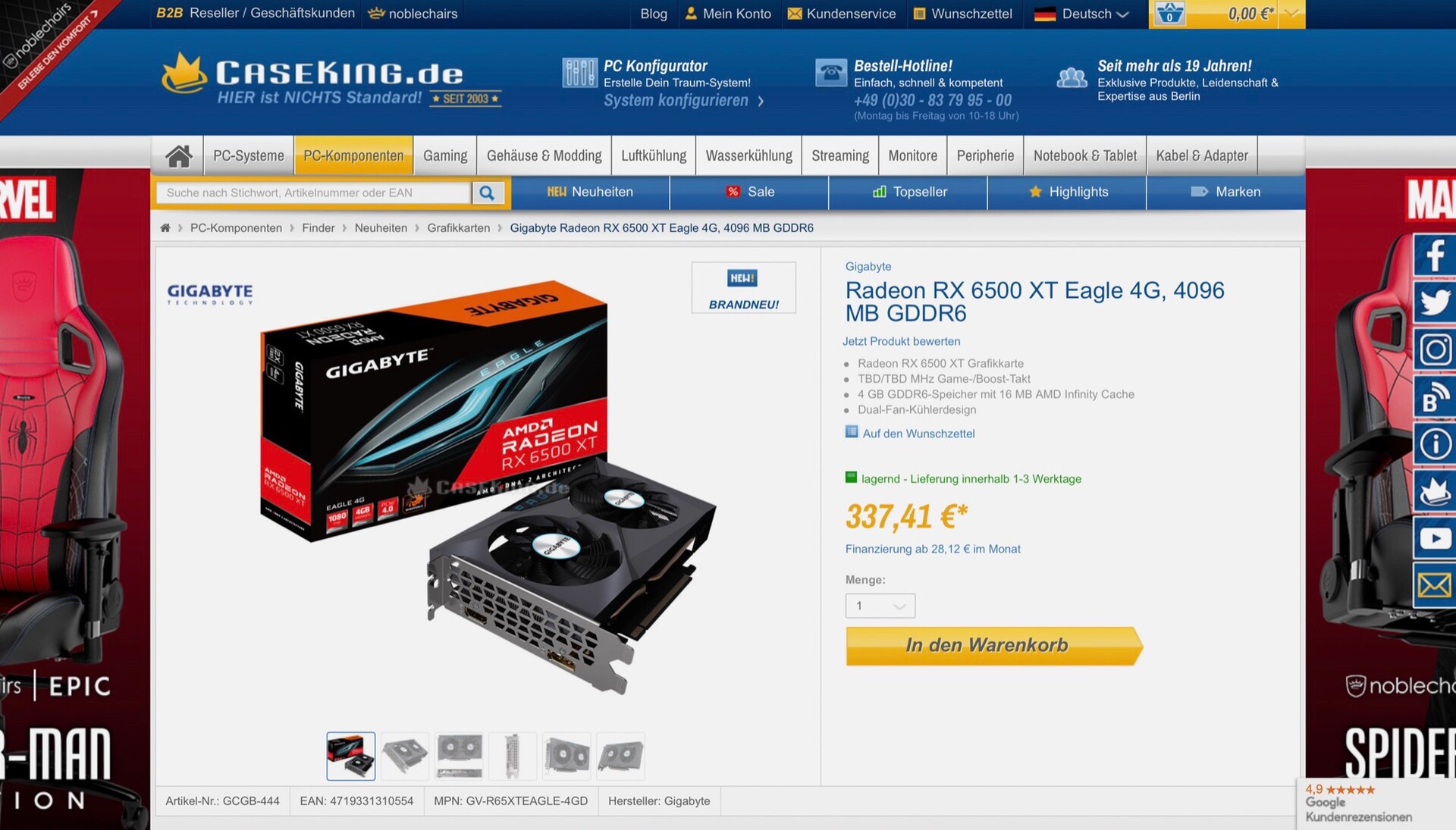 Der Haken: Die Gigabyte Radeon RX 6500 XT Eagle als derzeit günstigste Variante wird von Caseking für 337,41 Euro angeboten, Mindfactory bietet eine PowerColor Radeon RX 6500 XT Fighter für 339 Euro an. Und das, obwohl die Grafikkarte selbst zum Listenpreis nicht besonders günstig wäre.