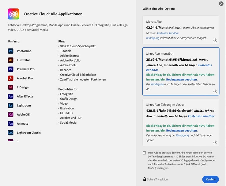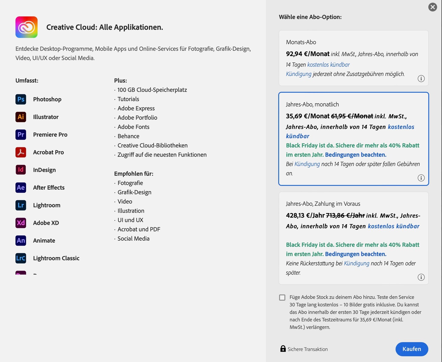 Das Abonnement enthält die beliebtesten Apps von Adobe, inklusive Photoshop, Illustrator, InDesign, Premiere Pro, After Effects, XD, Lightroom und Acrobat Pro. Darüber hinaus erhalten Abonnenten 100 GB Cloud-Speicher, Zugriff auf exklusive Tutorials, auf Adobe Fonts und auf Adobe Express. Die Abonnements für einzelne Anwendungen sind zum Black Friday nicht günstiger. Wer beispielsweise nur Photoshop und Lightroom benötigt, ist mit einem Einzel-Abo für 11,89 Euro pro Monat aber dennoch besser beraten.