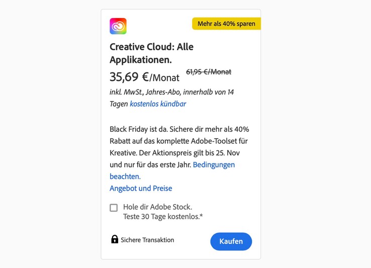Das Adobe Creative Cloud Abonnement kann aktuell über die Webseite von Adobe für nur 35,69 Euro pro Monat abonniert werden, statt der 61,95 Euro, die normalerweise monatlich fällig werden. Diese Aktion gilt noch bis zum 25. November 2022, bei einer Mindestlaufzeit von zwölf Monaten. Ob die vollen 428,13 Euro, die im Laufe dieses Jahres fällig werden, im voraus bezahlt werden, oder ob die Abo-Gebühr monatlich beglichen wird, können Kunden selbst entscheiden.