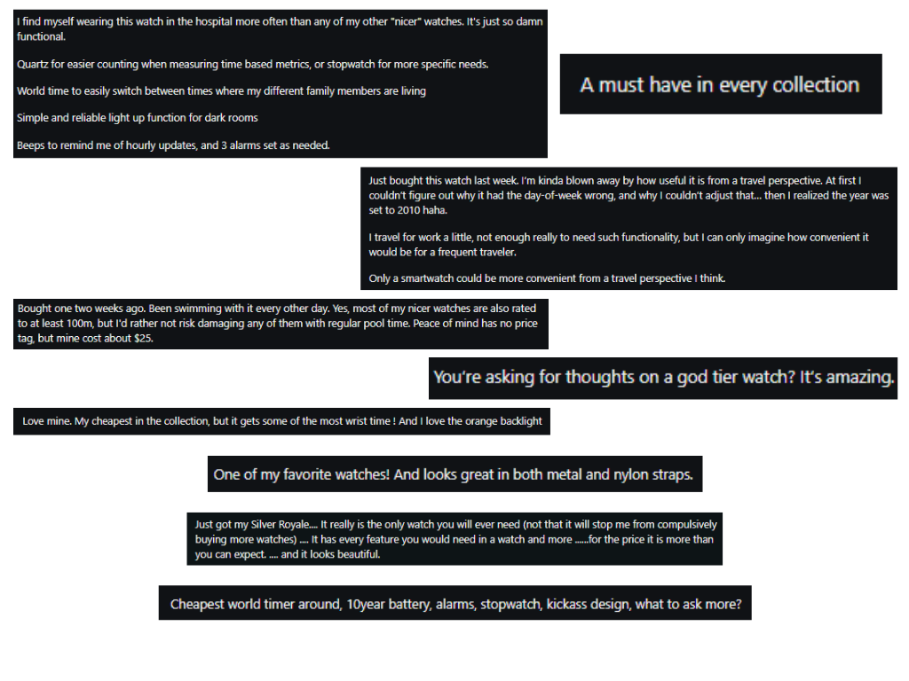 Warum scheinen so viele Menschen diese Uhr zu lieben, wie Hunderte von Kundenrezensionen in Online-Foren wie Reddit zeigen? Ganz einfach: Die AE-1200WH ist zuverlässig, hat einen unterhaltsamen Retro-Charme und ist mit Funktionen ausgestattet, die weit über ihren Preis hinausgehen. Außerdem macht es einfach Spaß, eine Uhr zu tragen, die sich etwas anders anfühlt. Die Casio AE-1200WH sorgt für Gesprächsstoff. Und seien wir ehrlich - es fühlt sich einfach cool an, eine "Weltzeituhr" am Handgelenk zu tragen, selbst wenn man die Zeitzonen nur um der Sache willen im Auge behält. Zudem versucht die Casio AE-1200WH gar nicht erst, mit Luxusmarken oder gar Mittelklasseuhren zu konkurrieren, sondern macht einfach "ihr eigenes Ding".