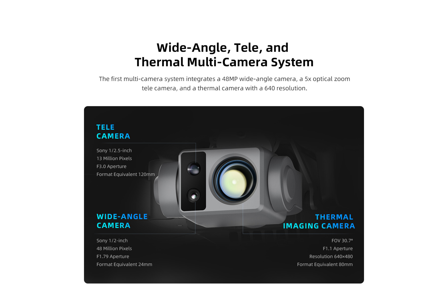 Der wahrscheinlich auch hierzulande nicht mehr komplett unbekannte Hersteller Fimi bringt mit der X8T eine neue Drohne auf den Markt. Die Besonderheit: Auf beziehungsweise am Gimbal ist nicht nur eine Kamera installiert, stattdessen stehen drei verschiedene Kameras bereits im Auslieferungszustand zur Verfügung. So ist eine Weitwinkelkamera mit einem 1/2-Zoll-Sensor von Sony und einer Auflösung von 48 Megapixeln vorhanden. Mit einer Brennweite (Kleinbild-Äquivalent) von 120 statt 24 Millimetern agiert die mit 13 Megapixeln auflösende Telekamera, womit sich entsprechend heranzoomen lässt. Die verbaute Wärmebildkamera löst mit 640 x 480 Pixeln auf und könnte sich beispielsweise gut etwa zum Erkennen von Glutnestern, Wärmebrücken oder für die Nachsuche beim Jagen eignen. Unterstützt wird auch eine Bild-in-Bild-Funktion und das Anzeigen der Bilder der verschiedenen Sensoren nebeneinander.
