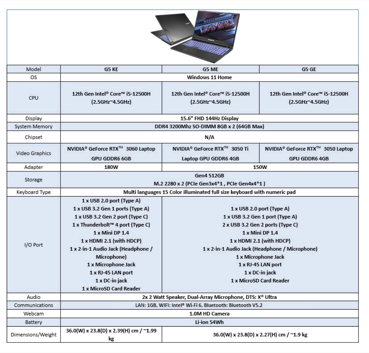 Gigabyte hat noch keinerlei Details zu den Preisen und zur Verfügbarkeit der neuen G5 und G7 bestätigt. Zum Vergleich: Das Vorgängermodell mit Intel Core i5-11400H, GeForce RTX 3060, 16 GB RAM und 512 GB SSD kostet 899 Euro. Nähere Details zu den neuen Modellen gibt es auf der Webseite des Herstellers.