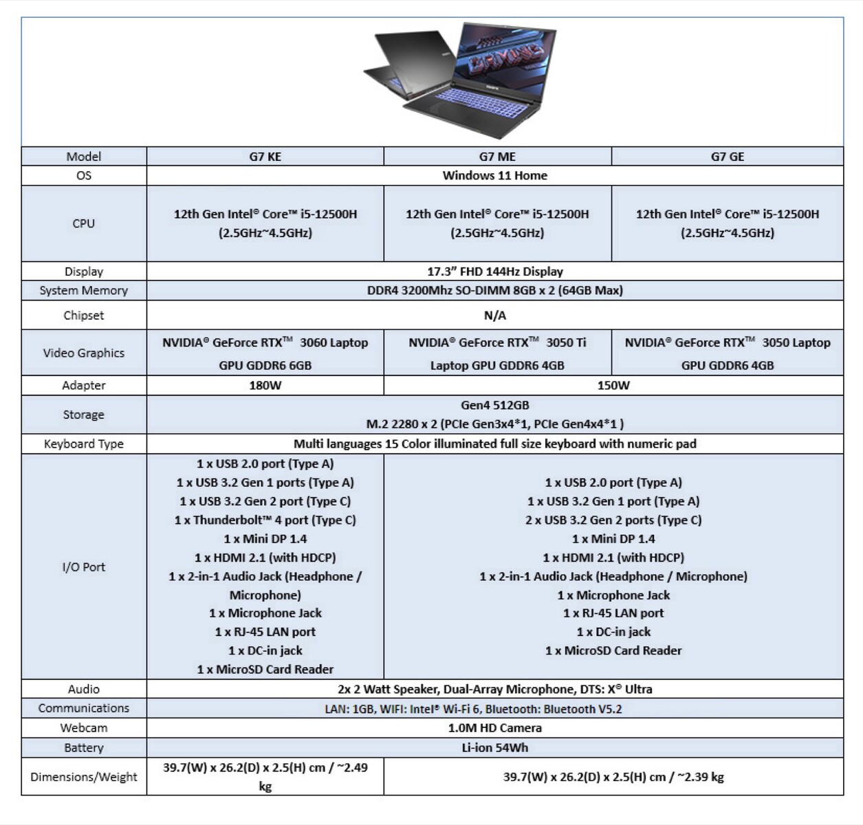 Das 15,6 Zoll große Gigabyte G5 und das 17,3 Zoll Gigabyte G7 haben ein Upgrade erhalten, die beiden Gaming-Notebooks sind nun mit dem Intel Core i5-12500H ausgestattet, der vier Performance-Kerne, acht Effizienz-Kerne und Taktfrequenzen bis 4,5 GHz bietet. Im Vergleich zum Core i5-11400H mit seinen sechs Kernen im Vorgängermodell verspricht der Chip vor allem eine deutlich bessere Multi-Core-Leistung.