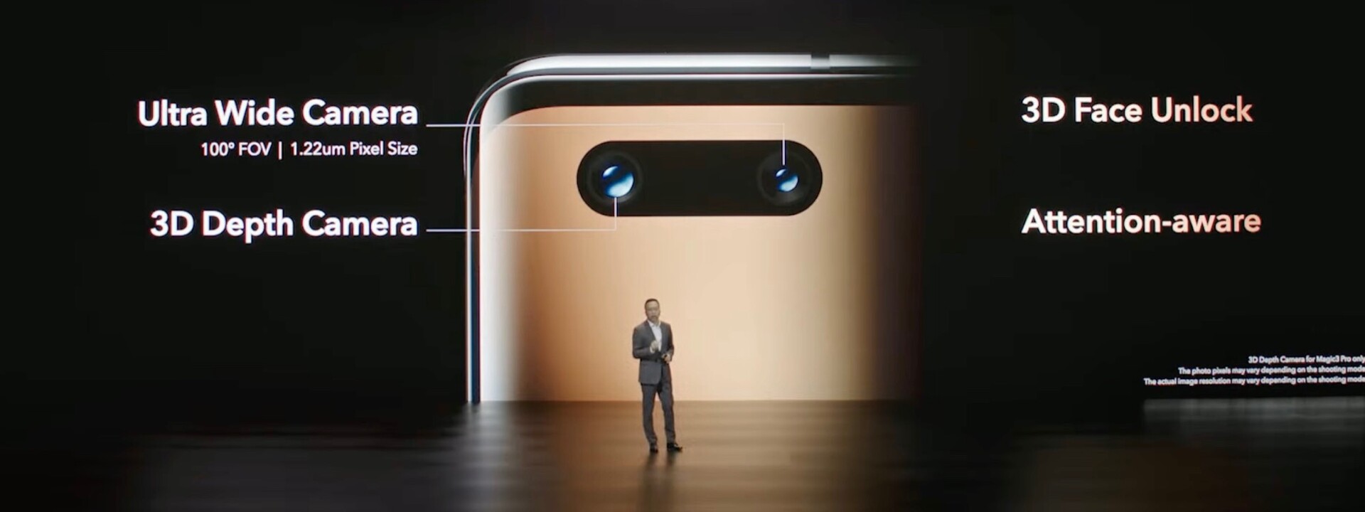 Diese bietet eine Brennweite von 90 mm (Kleinbild-äquivalent), also einen 3,5-fachen optischen Zoom, mit digitaler Vergrößerung kommt das Magic3 Pro auf 100-fachen Zoom. Eine pillenförmige Punch-Hole beherbergt die Ultraweitwinkel-Frontkamera sowie eine 3D-Tiefen-Kamera, welche das sichere Entsperren des Smartphones per Gesichtserkennung ermöglichen soll. Dank Attention Awareness wird das Display niemals gedimmt, während der Nutzer dieses aktiv betrachtet. Magic-Log und Audio-Zoom versprechen erstklassige Video-Aufnahmen.
