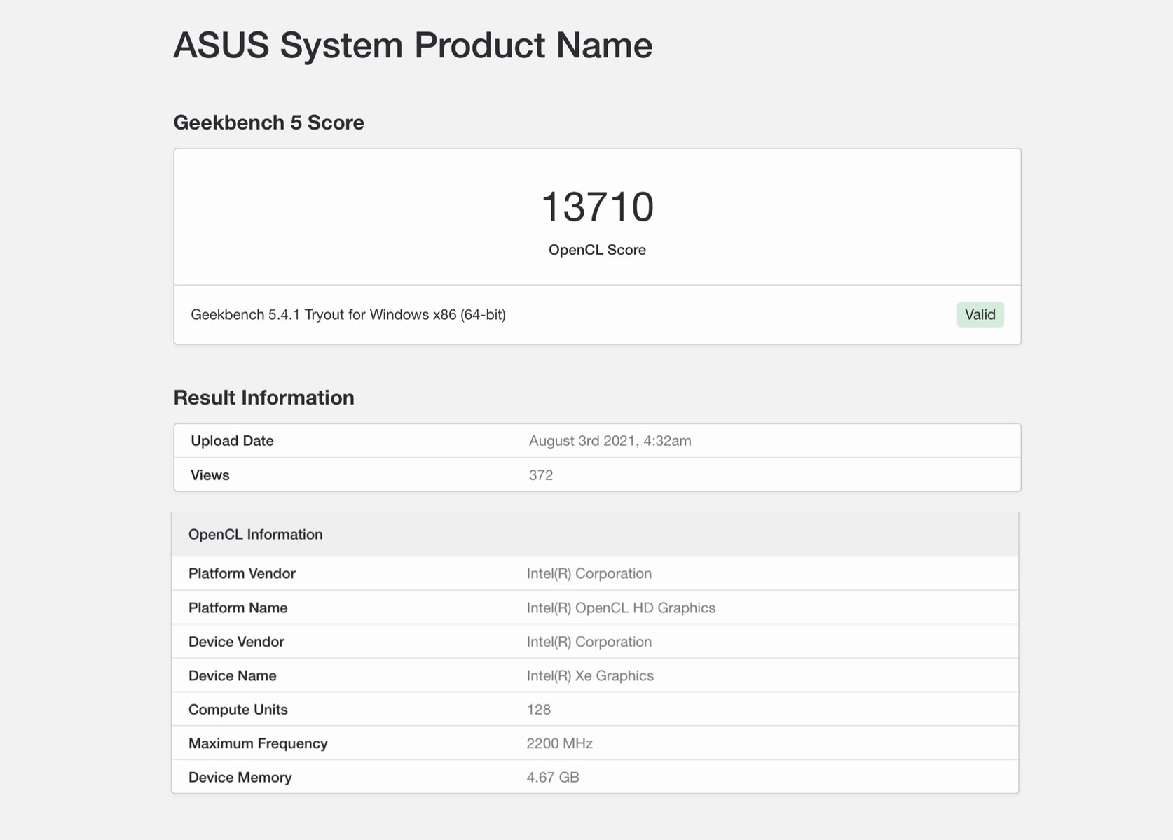 Die Mittelklasse-Grafikkarte erreicht mit insgesamt 1.024 Recheneinheiten und Taktfrequenzen von 2.200 MHz eine Geekbench 5 OpenCL-Wertung von 13.710 Punkten – damit liegt die GPU in etwa auf Augenhöhe mit der Nvidia GeForce MX350. Wie bei derart frühen Benchmarks üblich dürfte das Ergebnis aber keineswegs die finale Performance der Grafikkarte widerspiegeln, da weder die Hardware noch die Treiber final sind.