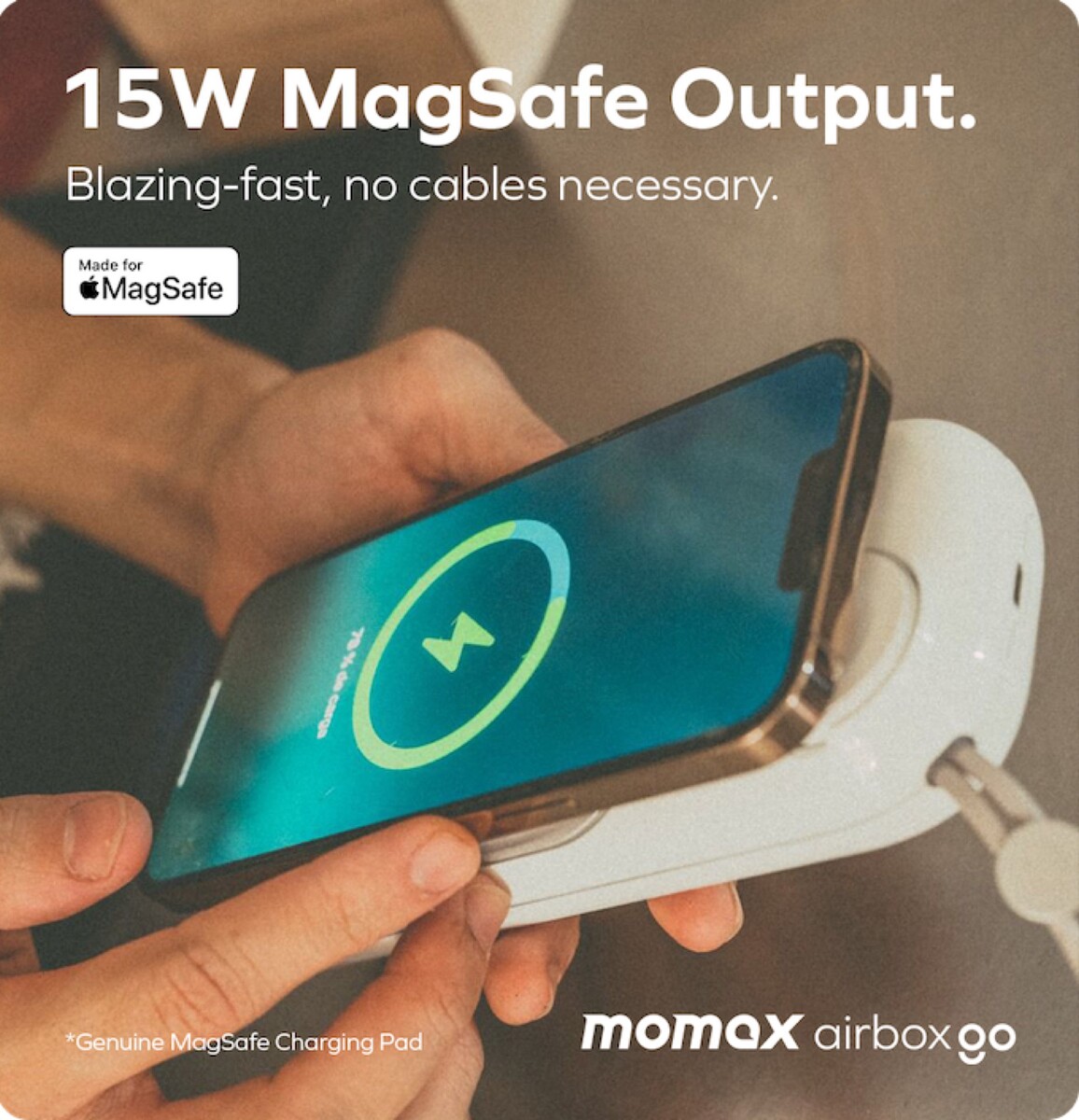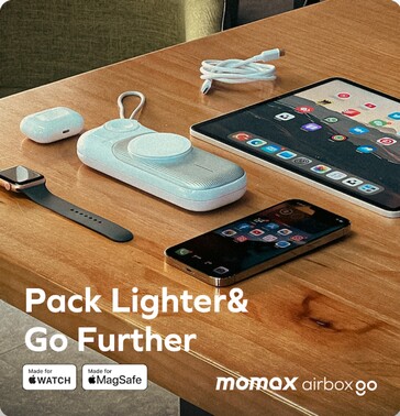 Die Momax AirBox Go soll der perfekte Reise-Begleiter für Apple-Kunden sein, denn das Gerät kombiniert eine ganze Reihe praktischer Features, angeführt von einem 10.000 mAh Akku. Diese Kapazität soll ausreichen, um sowohl ein iPhone als auch eine Apple Watch und AirPods Pro (ca. 190 Euro auf Amazon) mehrmals vollständig aufzuladen.