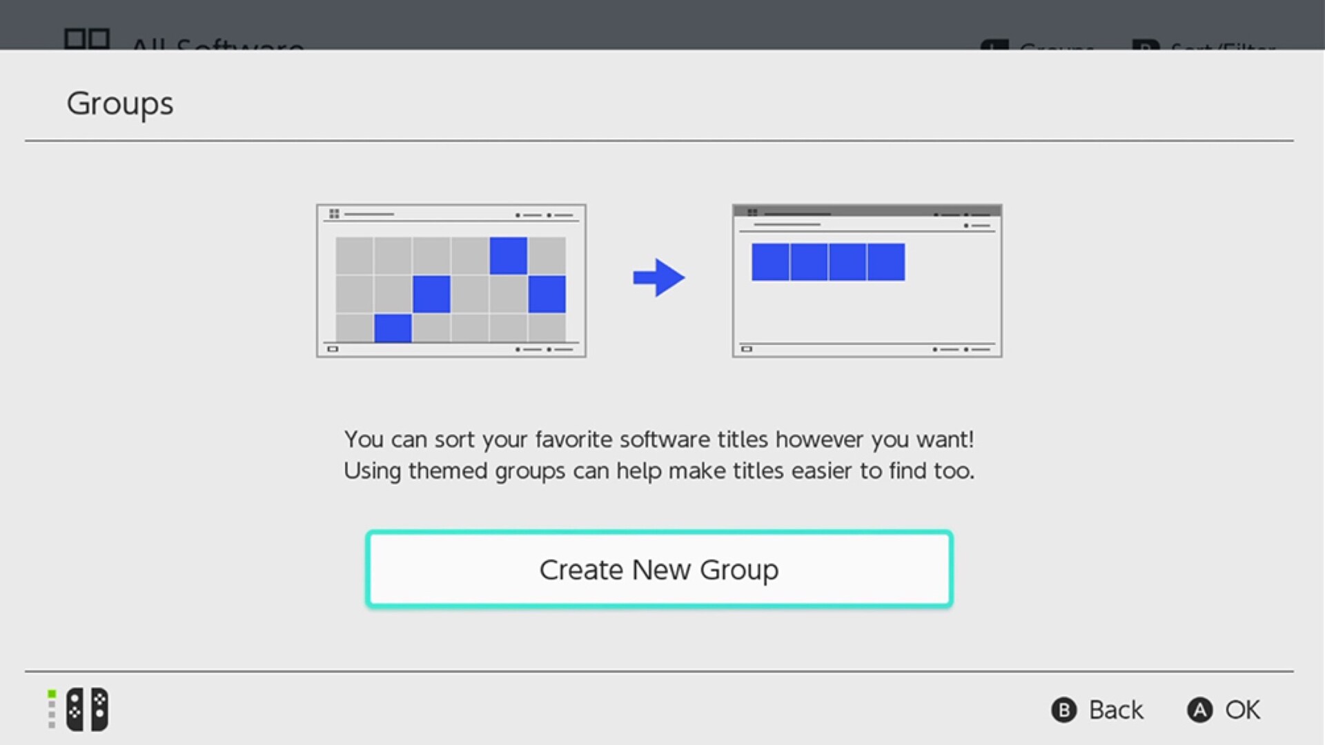 Statt diese direkt am Homescreen zu platzieren, müssen Nutzer aber die gesamte App-Liste öffnen, um auf ihre Ordner zugreifen zu können. Anschließend können über den "L"-Button alle eigenen Gruppen angezeigt werden, per "+"-Button lassen sich neue Gruppen erstellen. Jede Gruppe kann maximal 200 Spiele enthalten, Nintendo erlaubt es, bis zu 100 dieser Gruppen zu erstellen. Nutzer können so beispielsweise alle Titel einer Serie, eines Entwicklers oder eines Genres bequem zusammenfassen, statt wie bisher nur die Wahl zwischen einer Sortierung nach Alphabet oder Spielzeit zu haben.