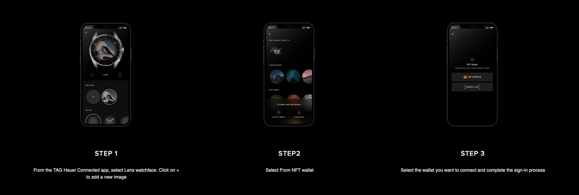 Das Zifferblatt bietet drei unterschiedliche Layouts an, die es ermöglichen, die Uhrzeit sowohl analog durch Uhrzeiger als auch digital darzustellen, oder aber über eine dezentere Ansicht, in der ein Dreieck und ein Kreis die Stunden und Minuten anzeigen. Um NFTs auf die TAG Heuer Connected Calibre E4 Smartwatch zu laden, muss das "Lens"-Zifferblatt über die zugehörige TAG Heuer Connected App ausgewählt werden, anschließend können NFTs aus Metamask oder Ledger ausgewählt werden, andere Plattformen werden derzeit noch nicht unterstützt.