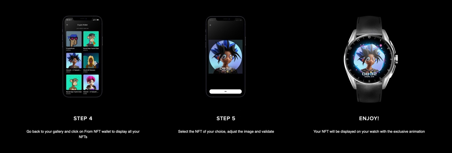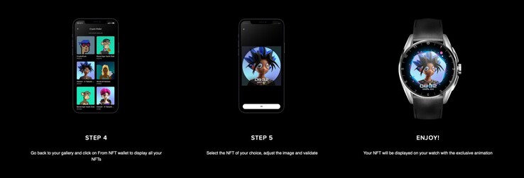 Die App erlaubt es, NFTs zu beschneiden, um den perfekten Ausschnitt für die Darstellung auf dem Zifferblatt auszuwählen. Wird ein NFT ausgewählt, so erhält das Zifferblatt eine exklusive Animation, die bei einfachen Fotos nicht zur Verfügung steht. Die TAG Heuer Connected Calibre E4 besitzt ein rundes OLED-Display, je nach Modell der Smartwatch mit einer Diagonale von 1,28 Zoll oder 1,39 Zoll, auf dem die NFTs bestmöglich zur Geltung kommen sollen. Während TAG Heuer offenbar viel Zeit in die Entwicklung dieses Zifferblattes gesteckt hat, lässt das Update auf Google Wear OS 3.0 weiter auf sich warten.
