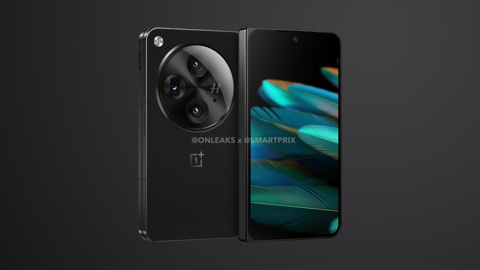 Der Hasselblad-Schriftzug weicht einem großen "H". Auf den Bildern sind nun auch vier Lautsprecheröffnungen zu erkennen, womit also ein Quad-Speaker-Setup zu erwarten ist. Ebenfalls noch erwähnenswert ist die Punch-Hole für die Selfie-Cam am Flex-Display an der Innenseite, die nun rechts oben statt links oben zu finden ist. Beibehalten hat OnePlus das edle Finish der Rückseite mit schwarzem Vegan-Leather-Bezug sowie den Stummschalter und den Fingerabdrucksensor im Power-Button an der Seite.