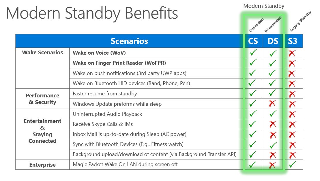 Es geht bei der früher auch als "Always-On" oder "Connected-Standby" beziehungsweise mittlerweile als "Modern Standby" bezeichneten Power-Management-Funktion auch darum, den PC mehr mit typischen Smartphone-Features wie sofortiger Verfügbarkeit auszustatten, auch wenn er im Standby-Modus schlummert. Sofern eine SIM-Karte installiert und ein Datenpaket verfügbar ist, wird der PC selbst im ausgeschalteten Standby-Zustand beispielsweise Benachrichtigungen erhalten und gleich nach dem Aufklappen des Displays anzeigen. PC runterfahren und neu booten sollte die Ausnahme werden und nicht mehr die Regel. Dies ist allerdings nicht nur für die neuen Laptops mit ARM-SoC verfügbar, auch moderne Notebooks oder Convertibles mit Intel- oder AMD-Prozessor können dieses Feature bieten, der Hersteller muss sie allerdings unterstützen (siehe Bilder unten). - Wieso ist das nächste Windows Update Redstone 4 Voraussetzung?