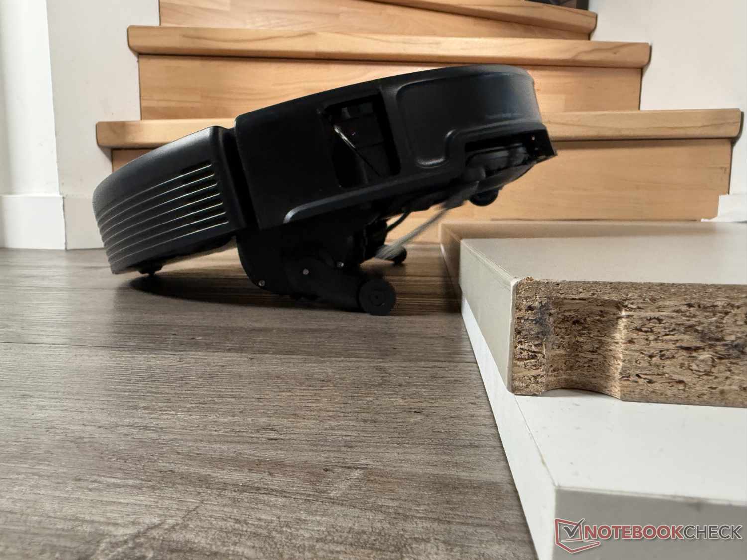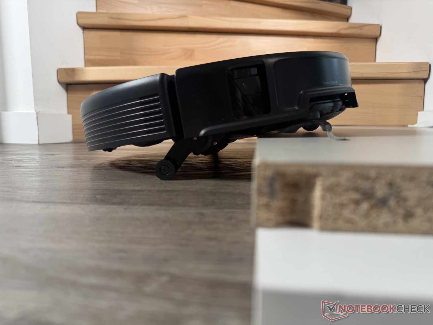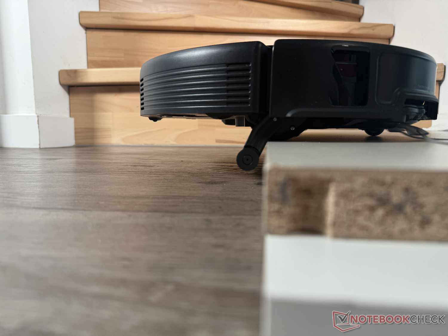 Dank seiner enormen Kletterfähigkeit bis 8,8 cm (in zwei Stufen) überwindet der Roborock Saros 20 quasi jede Türschwelle. Im Praxis-Test hat er eine 4,5 cm hohe 90-Grad-Kante erfolgreich erklommen, auch wenn es zeitweise etwas mühsam aussah. Hierfür fährt er seine zwei kleinen Hilfsbeine aus, um sich erst vorne hochzubocken und anschließend den Hintern folgen zu lassen.